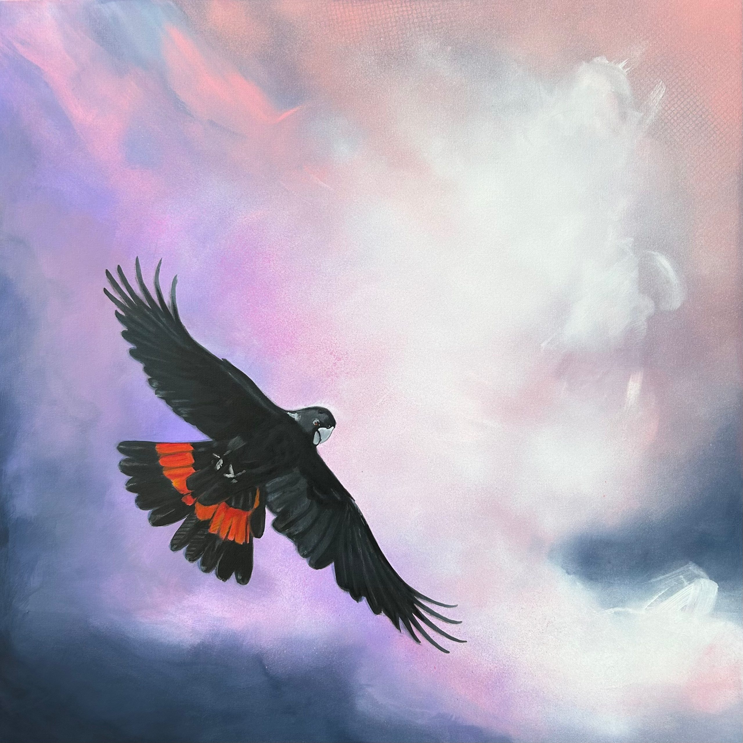 Red, purple and pink represent the fire element in Feng Shui. The fire element is related to the yang energy of the Sun. It is masculine energy that is motivated and driven. We are fully dependent on fire for it’s life-giving energy. All beings, including plant life, need the sun to activate their life force; to grow and thrive. However, we never want too much fire because we know if it has a big effect, fire can be destructive. So in Feng Shui the fire element should be subtle to ignite our passions. This painting is deliberate in bringing a subtle intention of the fire element to your home and life to ignite your dreams. The red-tailed black cockatoo is a beautiful, graceful bird that carries a small flicker of fire in it’s tail feathers. These birds are also believed to be the guides and guardians of the spirits of loved ones.