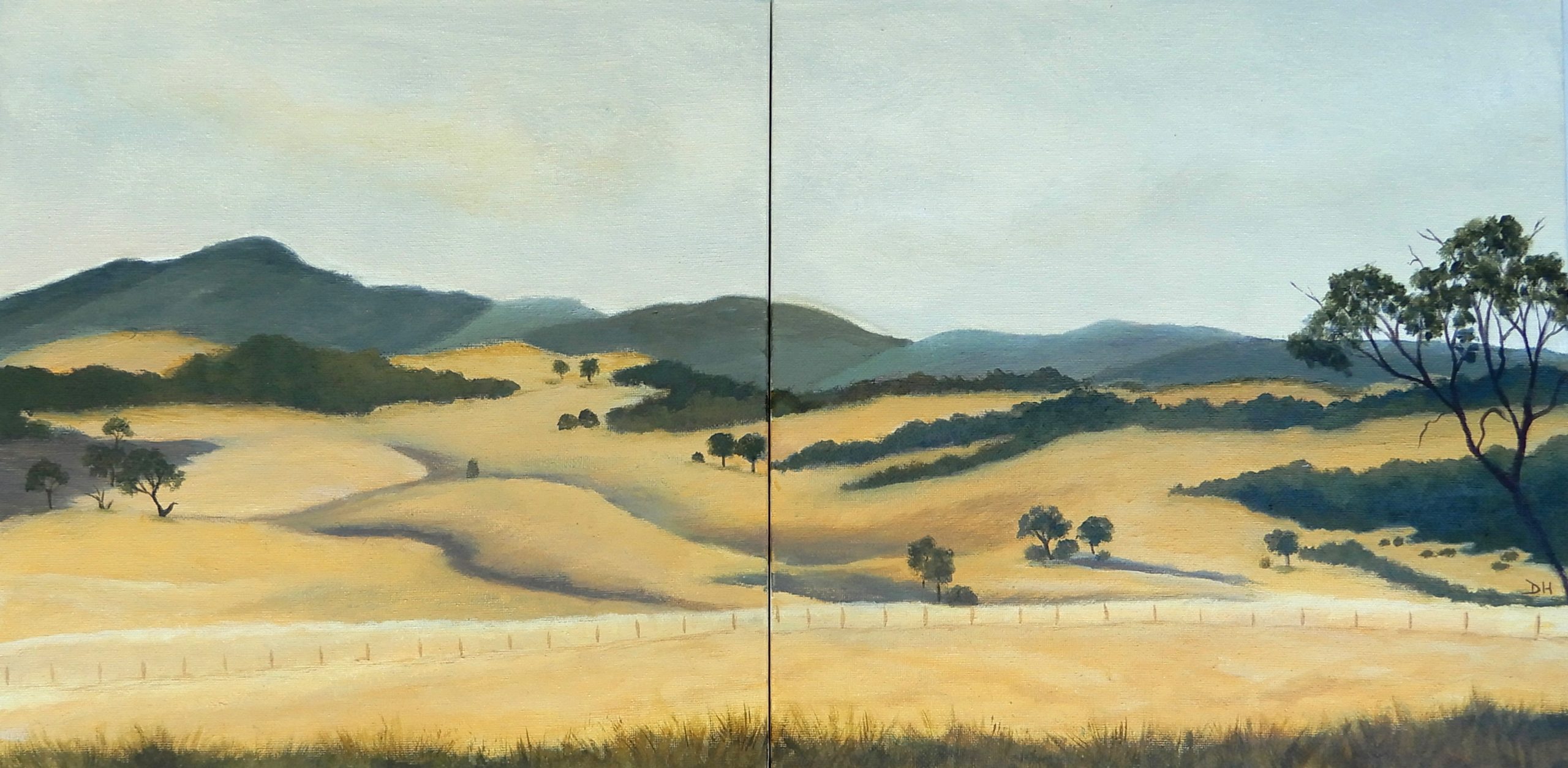 Golden afternoon light spills over the gentle undulations of cleared farmland in this diptych artwork.