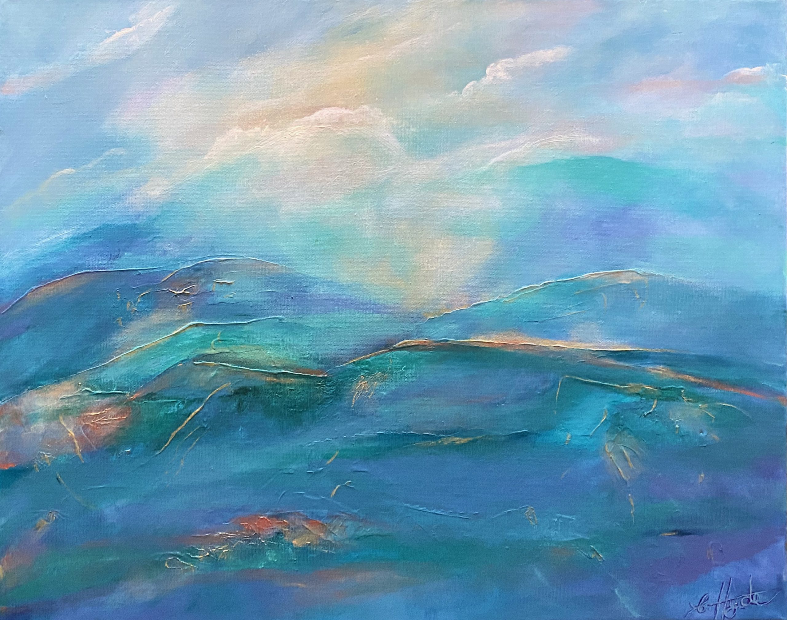 Light Over the Blue Mountains by Christine Hyde is a textured impressionist painting on canvas, which captures the atmospheric first light over the Blue Mountains of NSW where Christine lives and creates either in her studio or en plein air. Christine constantly finds her inspiration in the beautiful misty mountains and hopes this artwork will offer a peaceful yet awesome vista to behold.