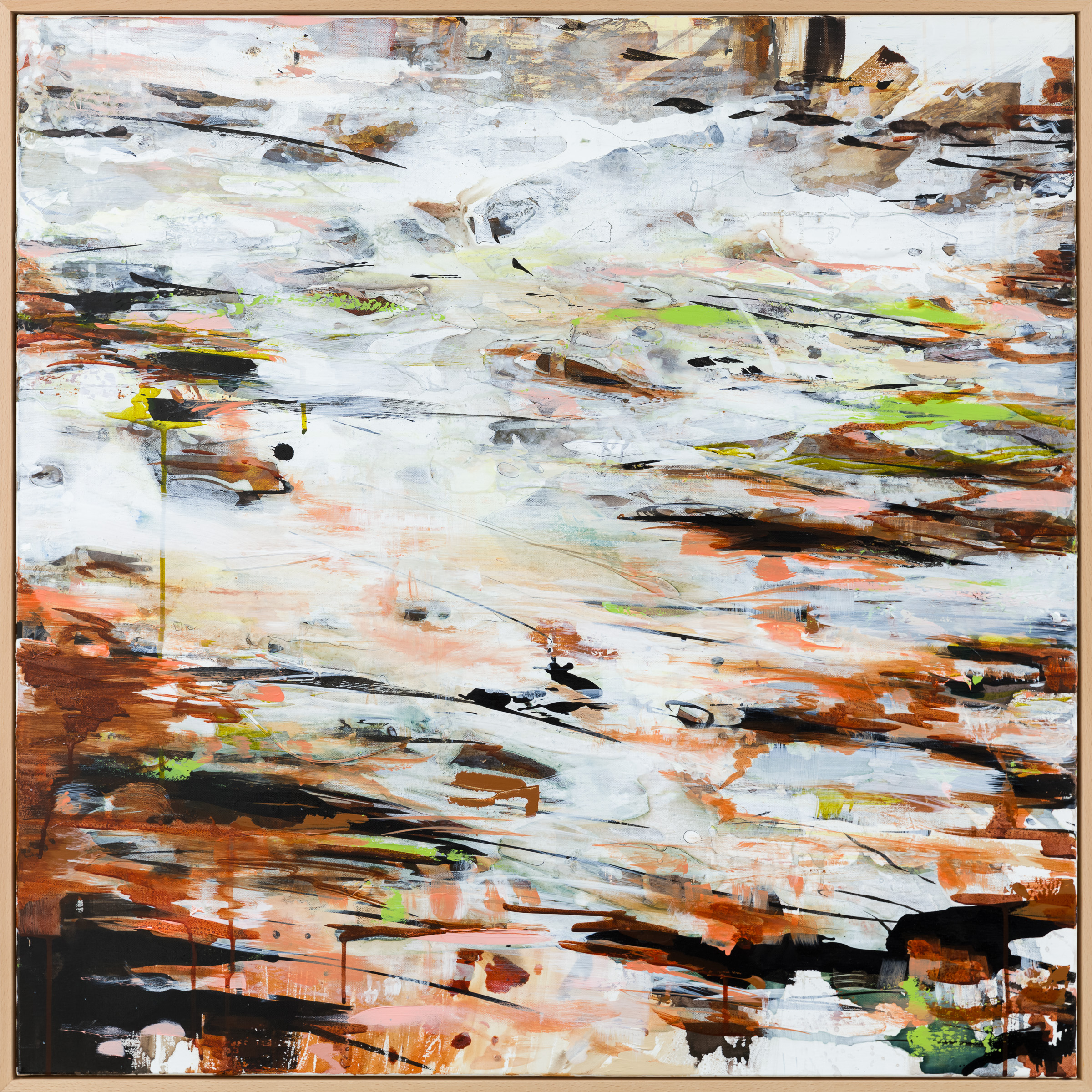 Light Play 1 by Wendy Rennie – Original Abstract Artwork inspired from the landscapes of the Hervey Bay area and the beautiful water and scenery from the surrounding coastal regions .  These pieces focus on the light and how it transforms the landscape into a symphony of colours and the way the light plays on the in between the space of the horizon and the foreshore and everywhere in between. This can come as an individual painting or as a set of two or even four artworks that work harmoniously together or as complete separate pieces. Each piece is framed the same way and whilst not made to be sold together each work blends together if the space would lend to bigger peices. The idea of the pictures are to capture movement and the subtleties of the beauty and the essence of the “Light Play” when faced with the never ending horizon line offered locally. The work is produced with high quality Acrylic and Ink products, sealed and on stretched canvas, which is professionally framed locally in Hervey Bay with an (drop in Style) oak veneer wooden frames.