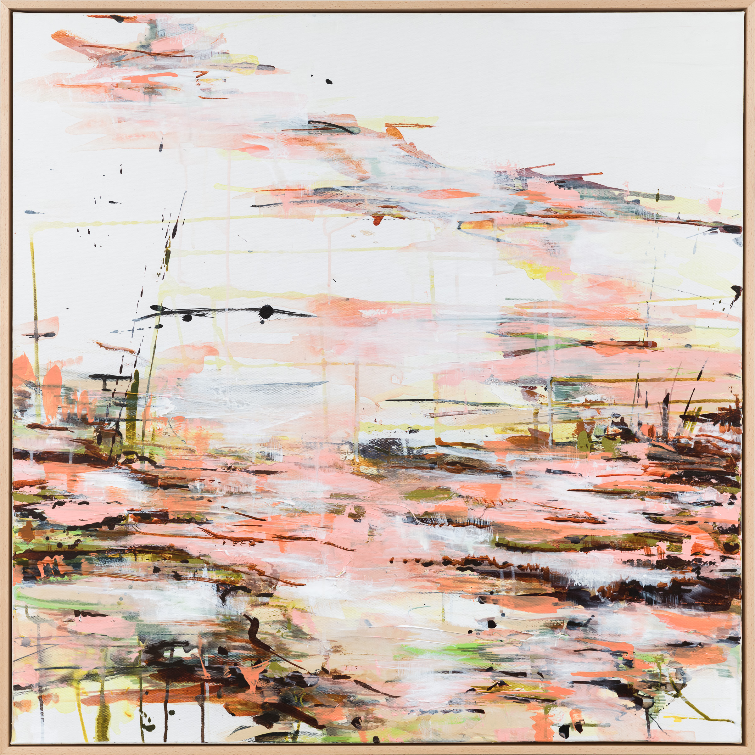 Light Play 4 by Wendy Rennie – Original Abstract Artwork inspired from the landscapes of the Hervey Bay area and the beautiful water and scenery from the surrounding coastal regions . These pieces focus on the light and how it transforms the landscape into a symphony of colours and the way the light plays on the in between the space of the horizon and the foreshore and everywhere in between. This can come as an individual painting or as a set of two or even four artworks that work harmoniously together or as complete separate pieces. Each piece is framed the same way and whilst not made to be sold together each work blends together if the space would lend to bigger peices. The idea of the pictures are to capture movement and the subtleties of the beauty and the essence of the “Light Play” when faced with the never ending horizon line offered locally. The work is produced with high quality Acrylic and Ink products, sealed and on stretched canvas, which is professionally framed locally in Hervey Bay with an (drop in Style) oak veneer wooden frames.