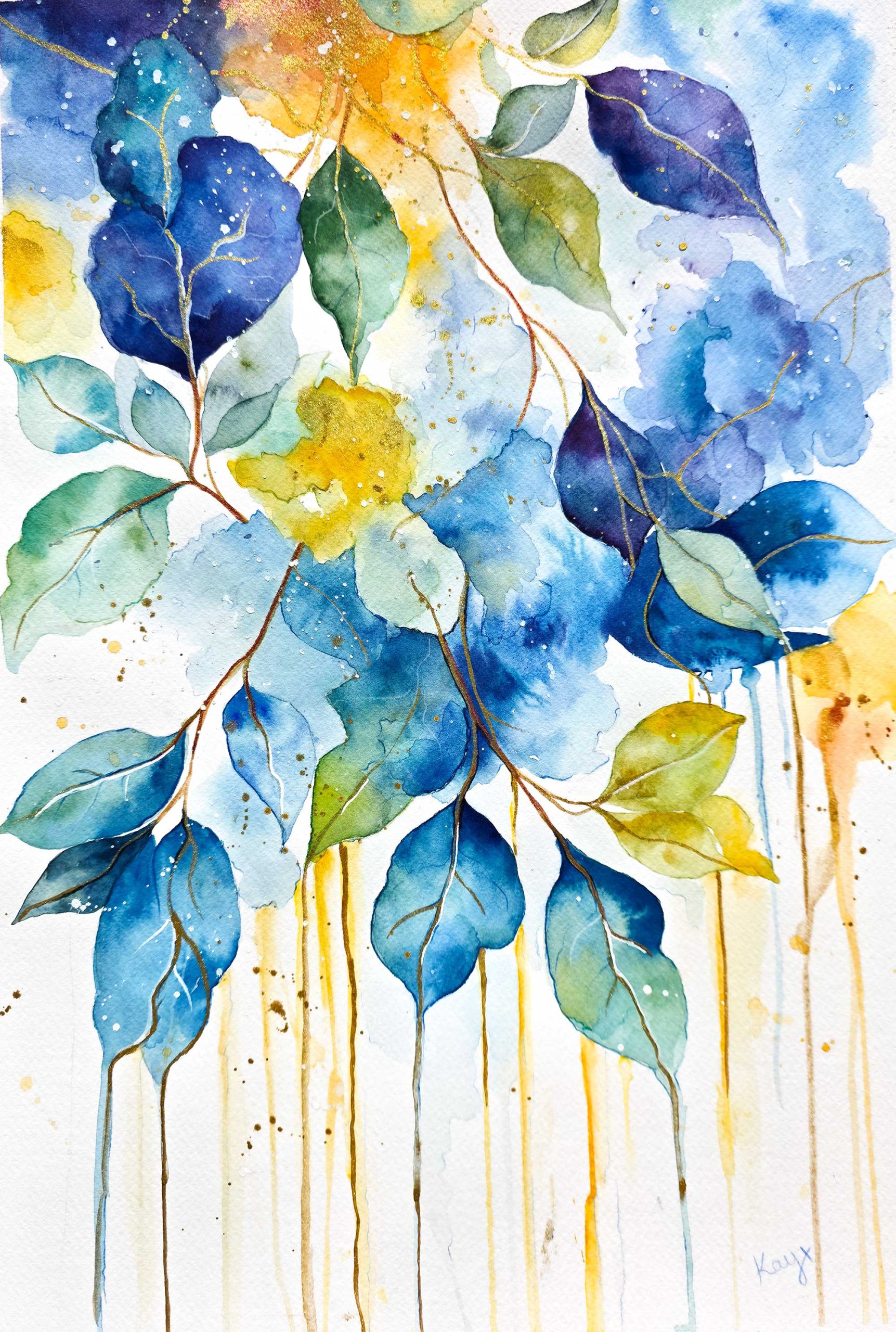 Lightfall by Kay Shanley captures the serene beauty of leaves cascading through luminous space, where vibrant blues, deep indigos, and golden washes melt into one another like sunlight through a forest canopy. Hints of metallic shimmer trace delicate veins, adding a touch of enchantment to this ethereal composition.