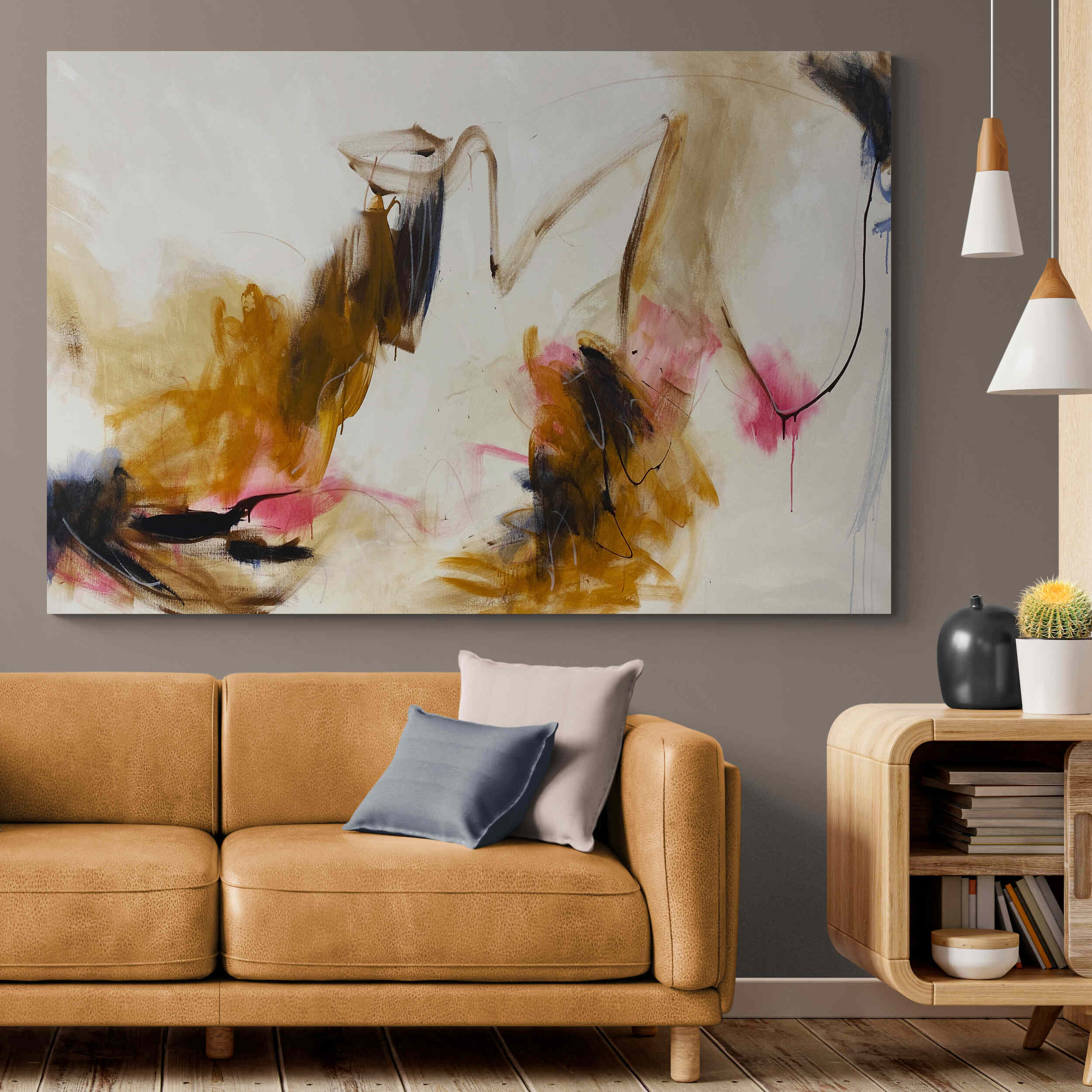 It’s intriguing mark making combined with its restful and calm palette of beautiful soft blush and subtle pinks, warm ochre and black, mixed with cool beige and white neutral tones makes this statement piece work so well in most spaces.