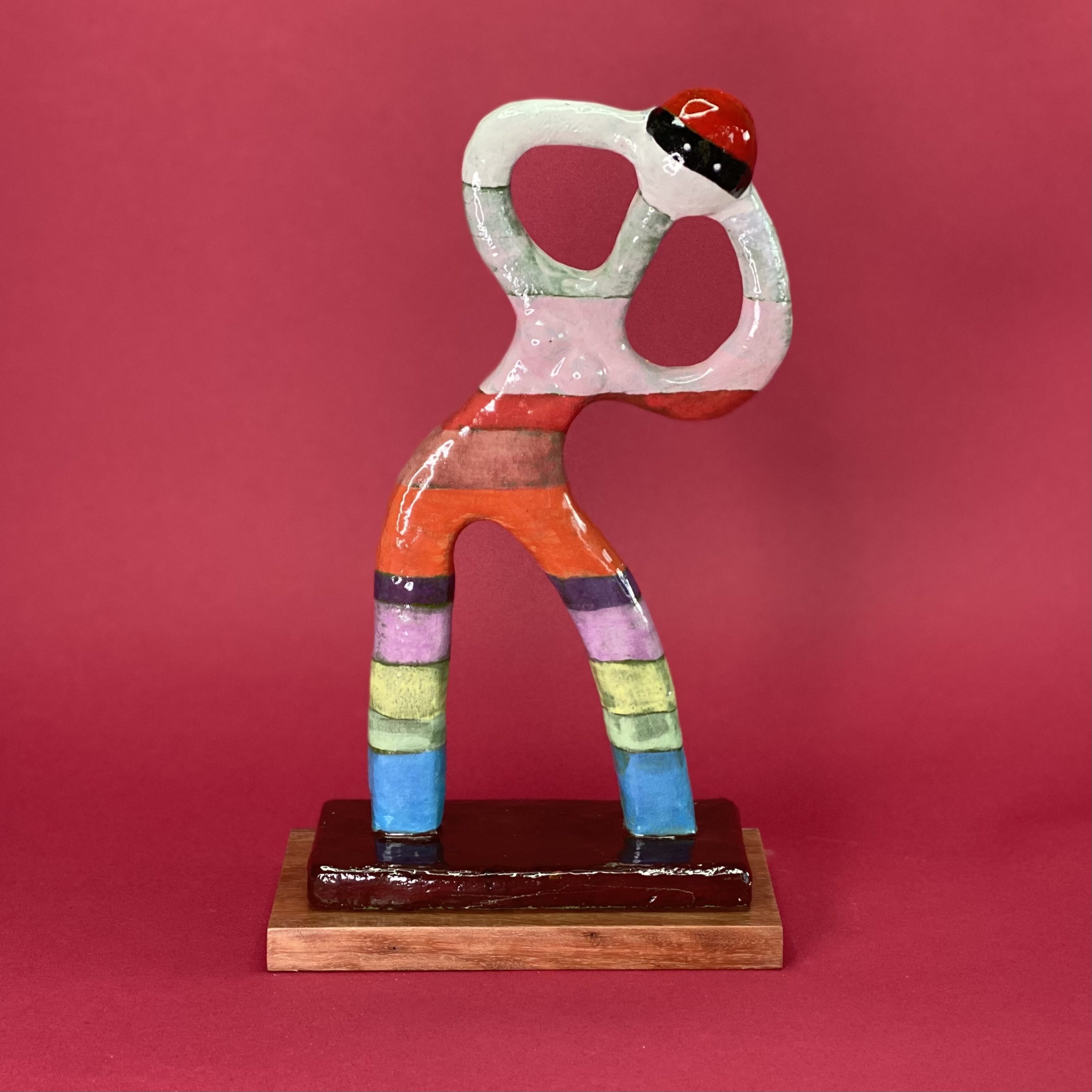 Female dancer in pose. White Raku, various glazes, hardwood base.Female dancer in pose. White Raku, various glazes, hardwood base.