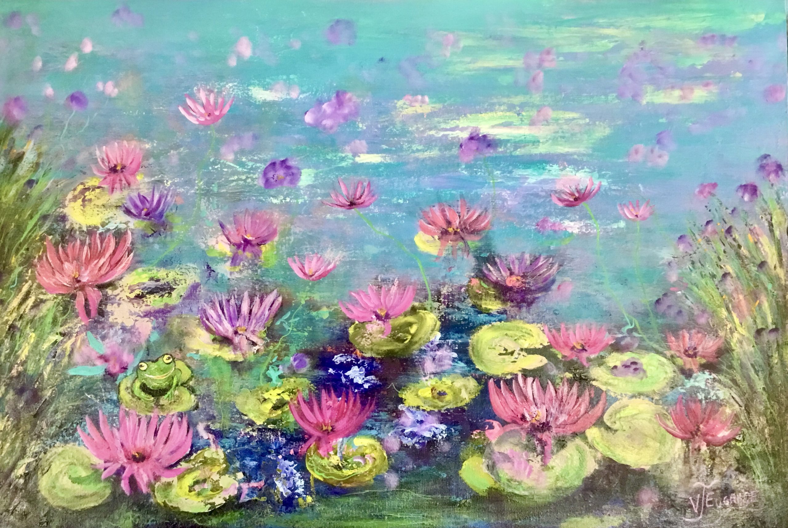 Lily Pond Impression  by Valerie Eugarde:- We have had heaps of rain this past week and I can hear the sound of happy Frogs all night so this painting is inspired by nature, it is a impressionist Lily pond done with my memories of my many ponds in places I have lived and left, a pond is such a beautiful place to sit at and reflect. It will bring a sense of serenity to any decor.