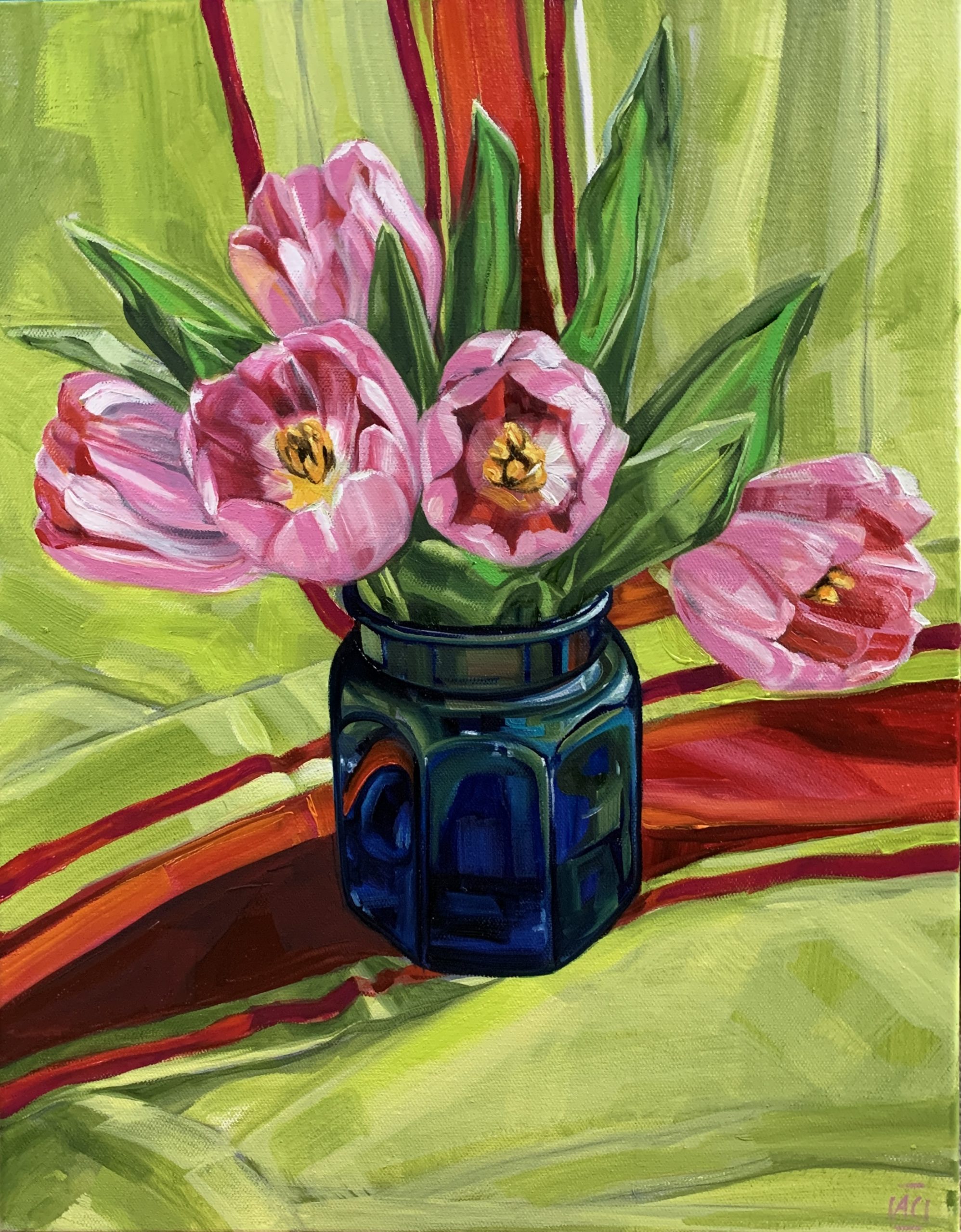 This painting combines three of my loves – locally grown tulips on a 70’s Lime green tablecloth. The bright lime contrast of this vintage tablecloth pops against the natural pink of the tulips, a bright and happy combination!