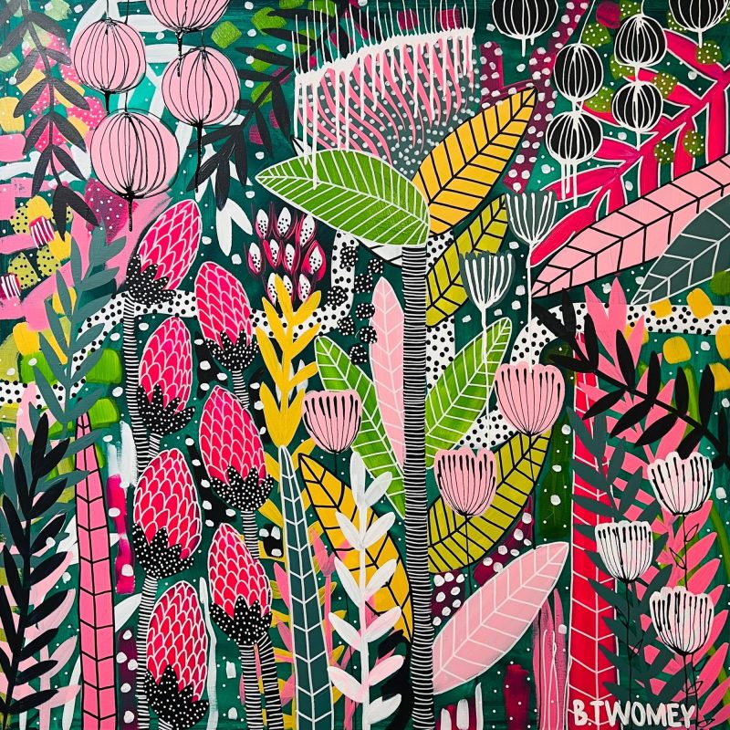 Linear River by Olga Megele is influenced by the great tradition of Australian Landscape artists. Australians grow up with certain elements of nature embedded into their psyche. The beach, the vastness of country, the Riverbank. Here the colours take on a heightened value, the clear air of a hot summer’s day has imbued the scene with an intenseness and palpable desire to meld with the river. Inspired by the waterways of Nowa Nowa In Victoria.