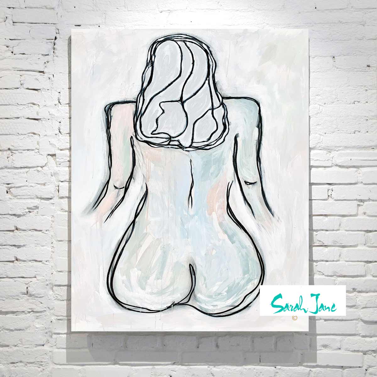 Surround yourself in the soft feminine energy from Linear Soeur I. A modern figurative painting womans curvy body and beautiful rounded bum. Soft colours in pastel tones by Australian Artist Sarah Jane. Love your bodies ladies!
