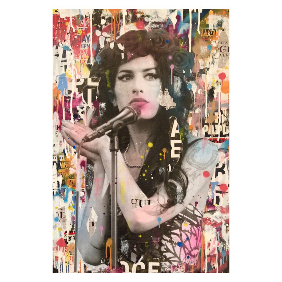 The main vintage image of Amy Winehouse was added and overlaid with a paper and paint