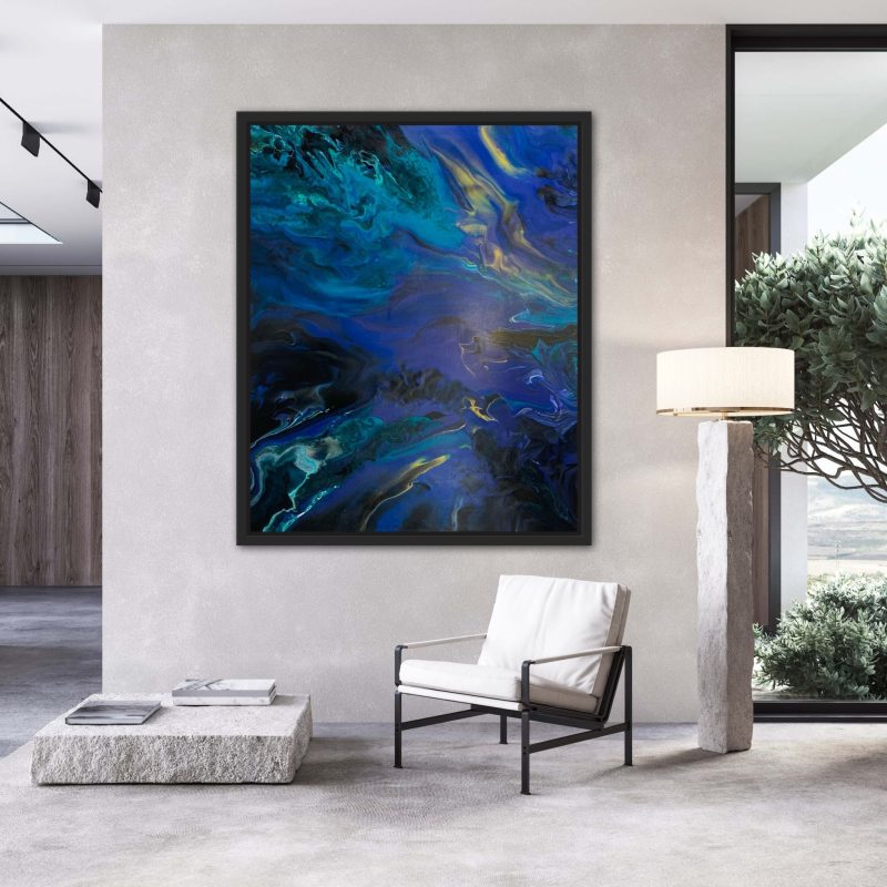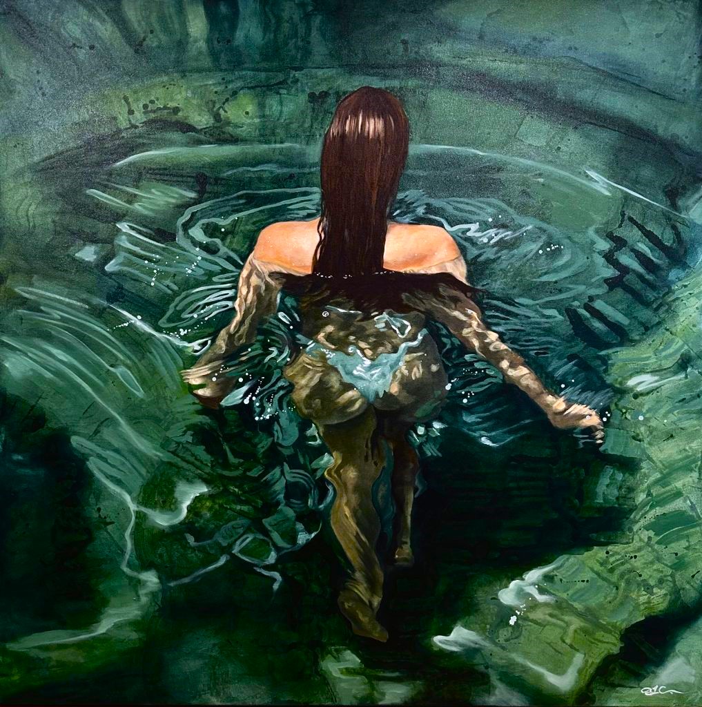Liquid Light by Amanda Cameron – is one of a new series called ‘Salt Water’. While still exploring the interaction and connection between water, light and form, this series also analyses the sense of disquiet when swimming in deep ocean water. At the same time, the main focus is the quest for refuge, quietness and escapism. These paintings juxtapose the lone swimmer and a few minutes of introspection when alone in deep water against the fear of the unknown. The constant struggle between hyper-realism and having a painterly quality to my work is a conflict that I am always trying to balance; therefore, thick paint and evident brush strokes are present when viewed up close. This piece is painted in professional oil paints on a museum-quality canvas and finished with edges painted and varnish for protection. It comes framed in a Natural Wood floating box frame, is ready to hang and includes a certificate of authenticity.