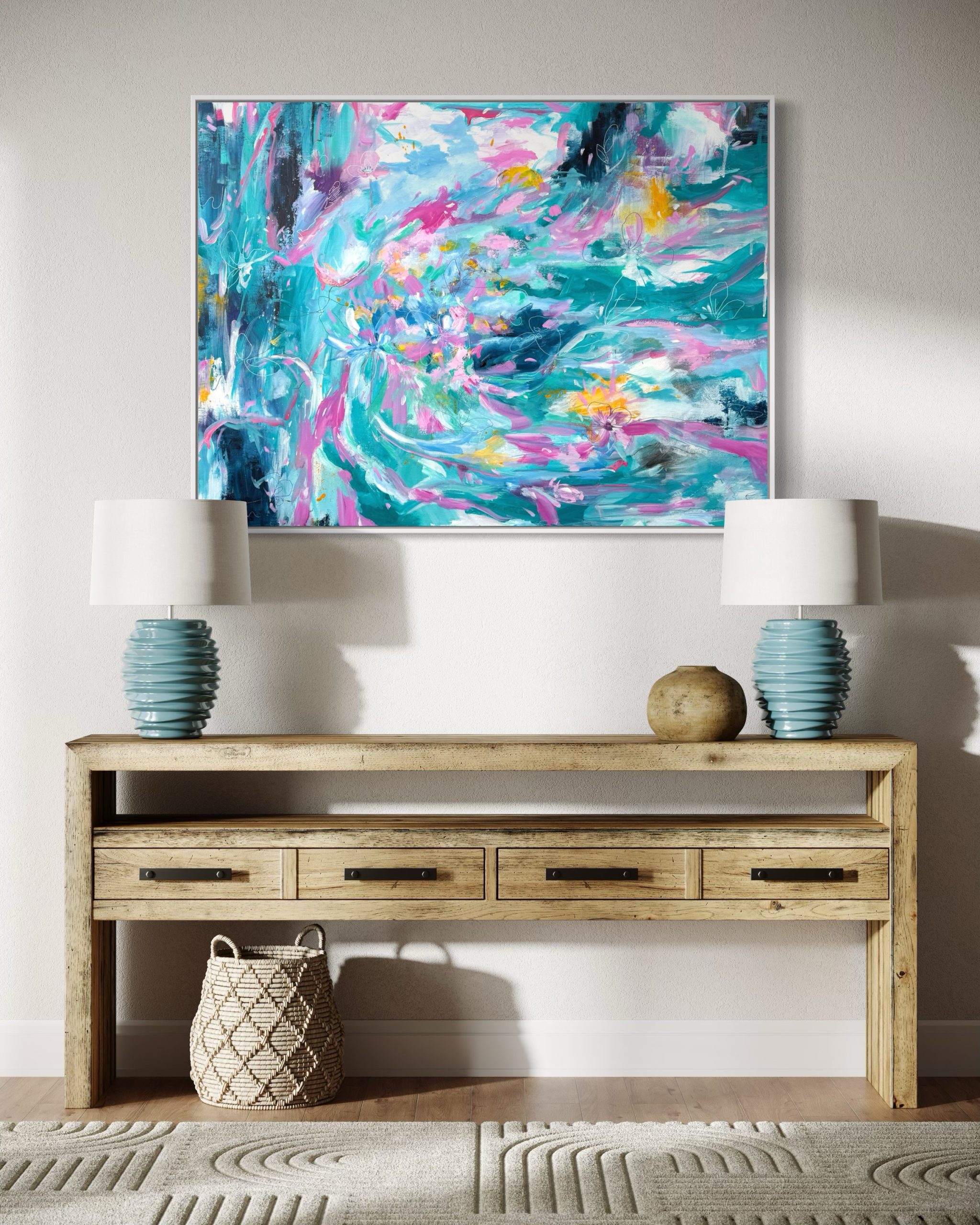 In this abstract expressionist piece, I explore the dynamic interplay between emotion and color through a vibrant, layered composition. The canvas becomes a playground for intuitive expression, where each stroke, drip, and scratch contributes to a dialogue between chaos and order. Dominant hues of pink, blue, and green-blue weave together with splashes of white, creating a rhythmic pulse that reflects the inner landscape of the human experience. Subtle floral impressions, rendered with an acrylic pen, punctuate the composition, offering fleeting moments of delicate beauty amidst the turbulence. This work is an invitation to experience the raw energy of abstract expressionism and find personal resonance within its fluid forms and vivid colours.