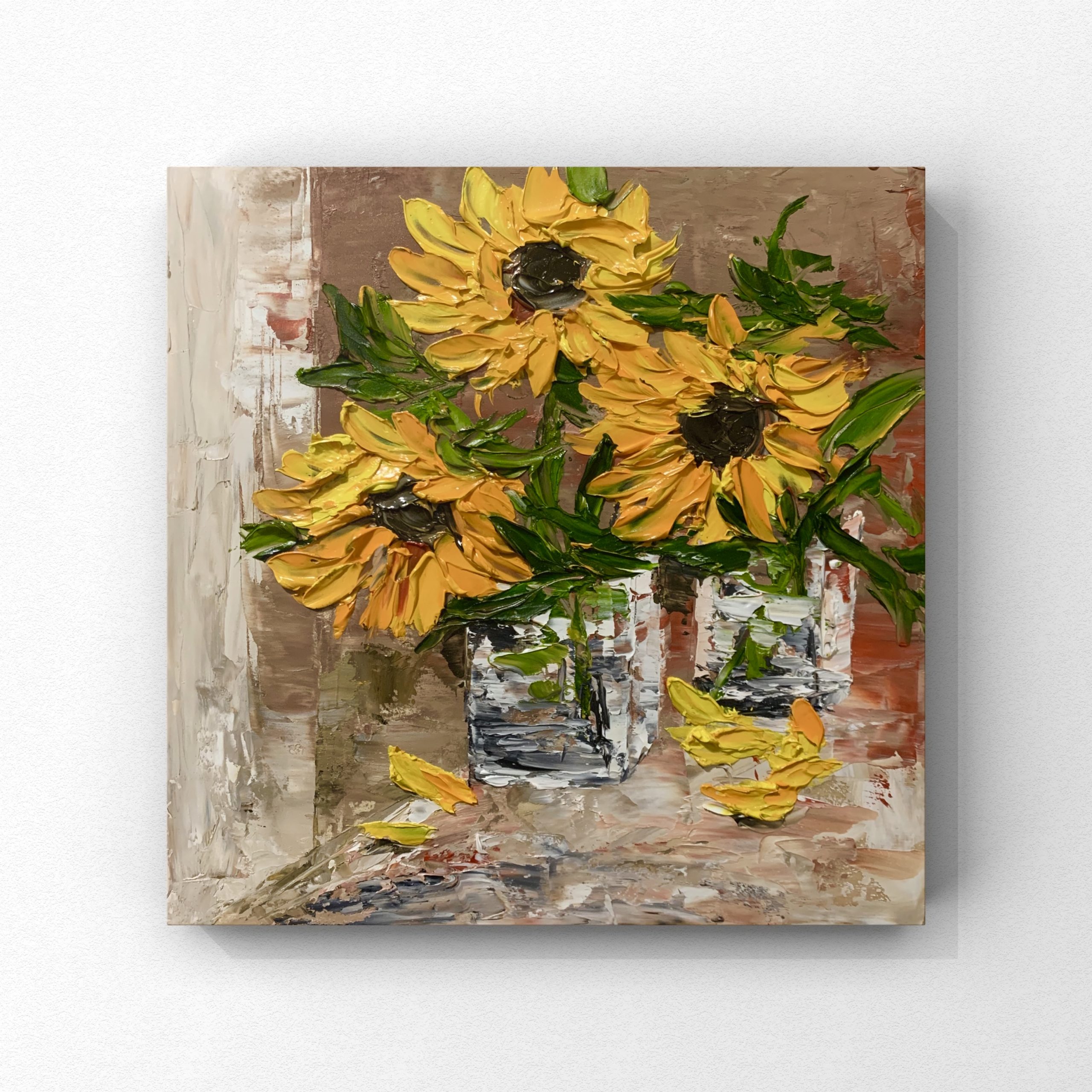 This colourful floral artwork is made using impasto technique with palette knife using thick textured layers of oil paint on wooden panel.