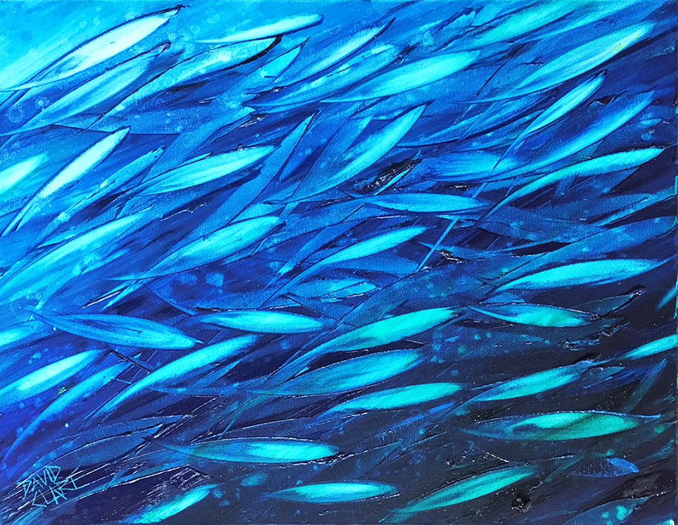 Little Blue Fish by David Clare – A close up of a school of fish as they shimmer by. Deep blue’s and greens with splashes of aqua and cyan. Some thick impasto textures to add to the interest. Lots of movement and energy in this small painting.