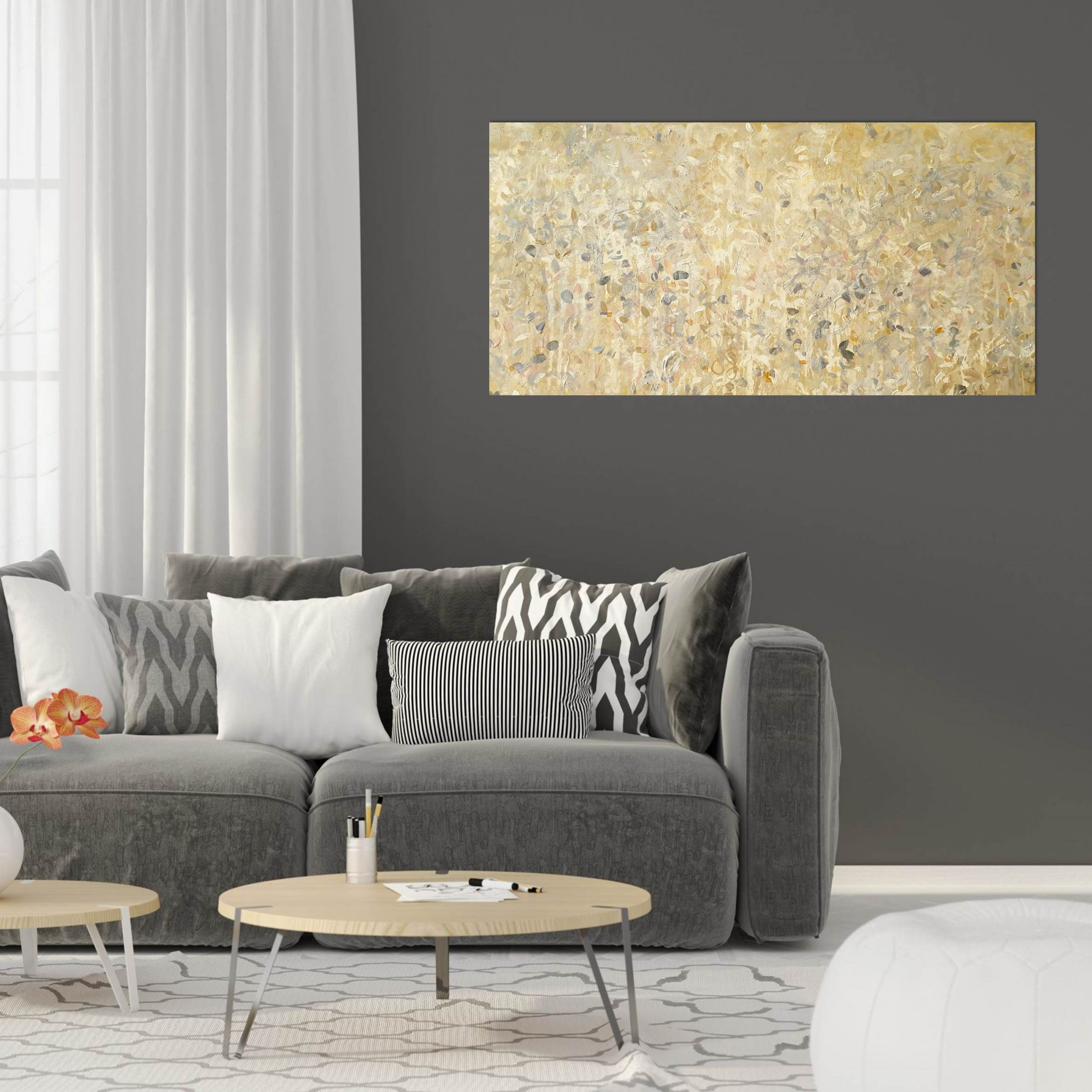 This artwork is finished with a soft satin protective finish and matte white edges. It’s feel within a room is gentle, calming and soothing yet expressive and quietly stunning; sure to make an appealing feature, at home equally in a domestic interior or corporate space.