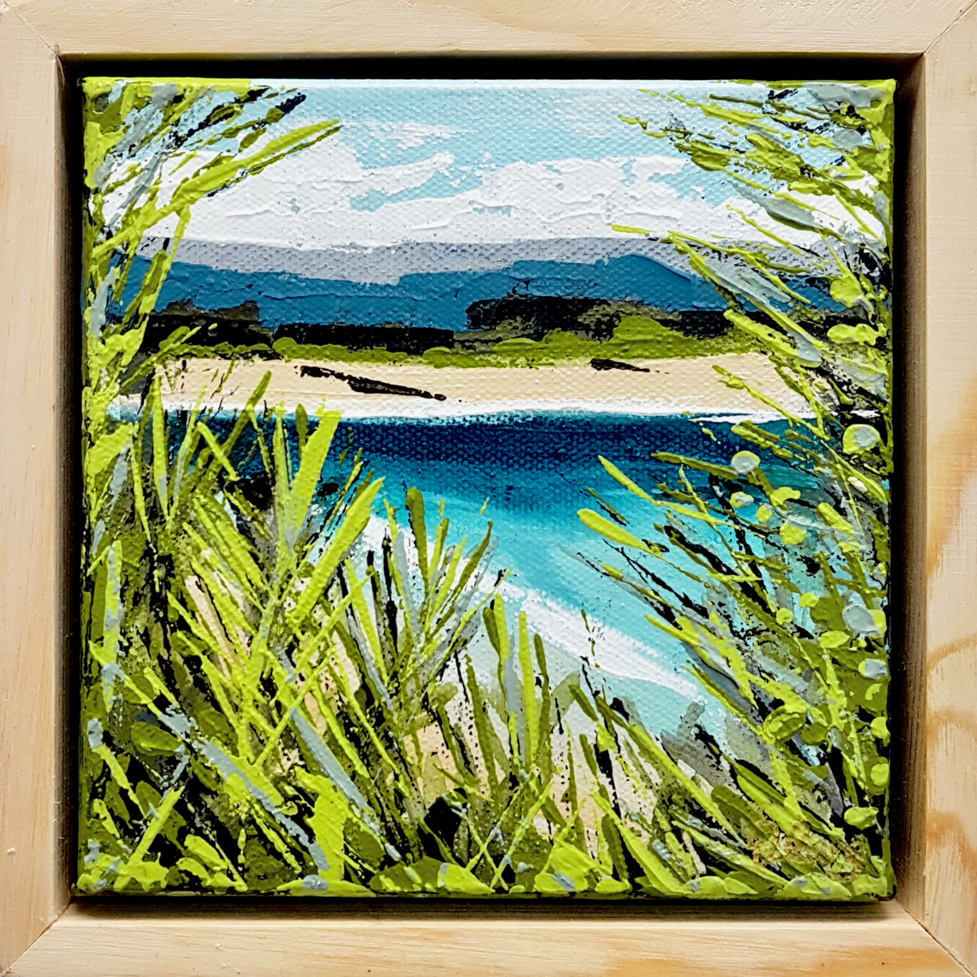 Hand painted on stretched canvas impasto style with a beautiful blue and green palette which pops against the soft sandy beach inspired by Little Cove Beach, Noosa, Queensland.