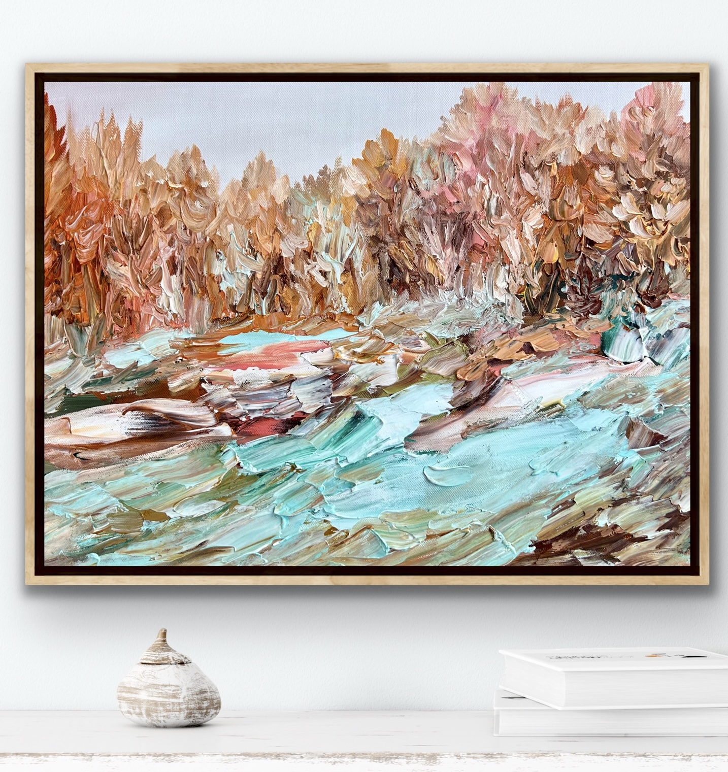 In this painting, I’ve employed thick, impasto brush strokes, capturing the vibrant and ever-shifting energy of a magical forest. Applied with pure acrylics, my technique celebrates the abstract yet softly transitions into impressionism, encapsulating the essence of nature’s enchanting unpredictability. This artwork is designed to evoke a sense of wonder and tranquility, bringing the transformative power of a colorful autumnal scape into any space it graces. This painting comes with an external frame. The painting is signed and dated at the back and comes with a certificate of Authenticity.