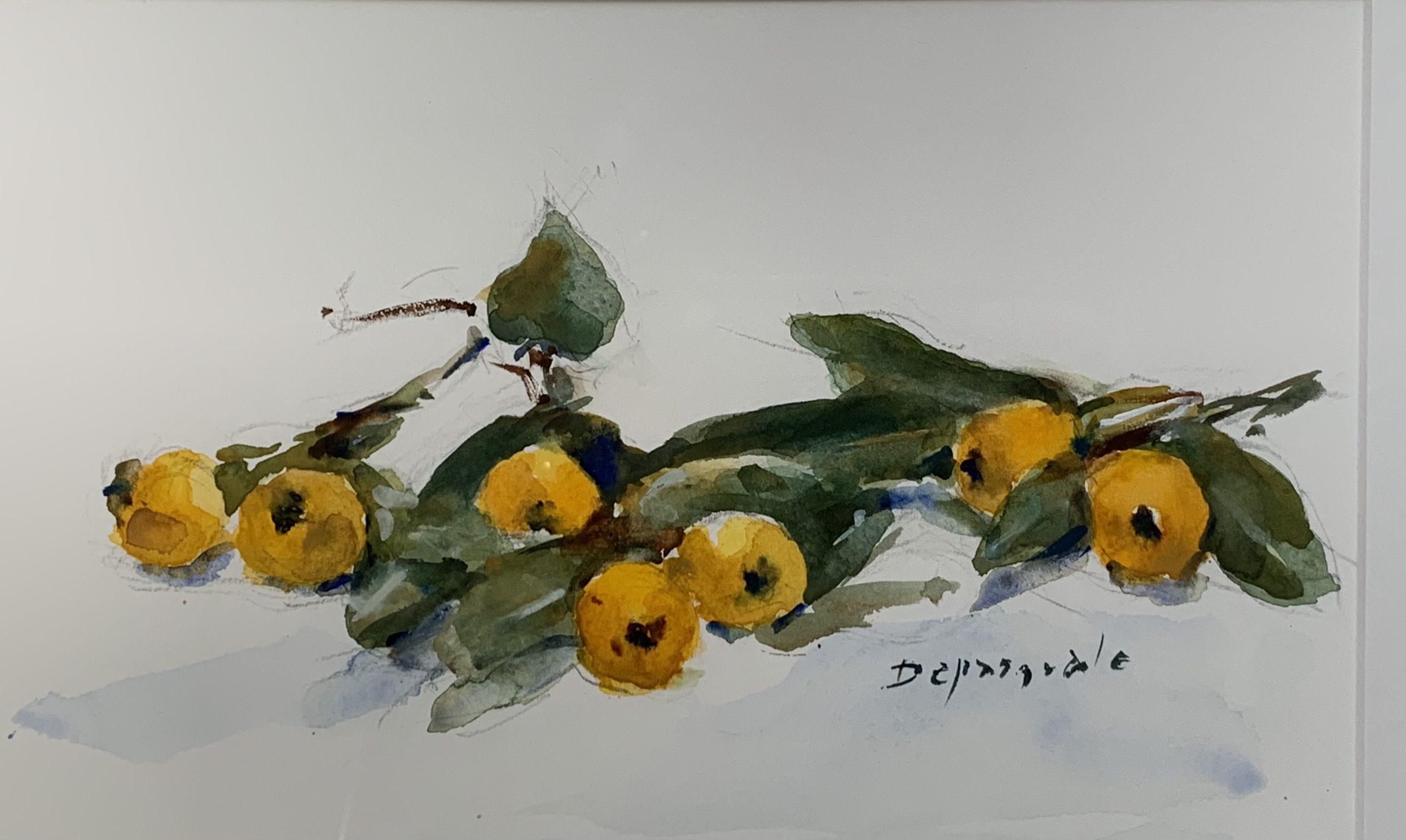 The subject of still life has a special place in art history and today is widely respected and a favourite preoccupation with contemporary artists. Here the representation is realistic ,however the watercolour application is free ,vibrant and contemporary.