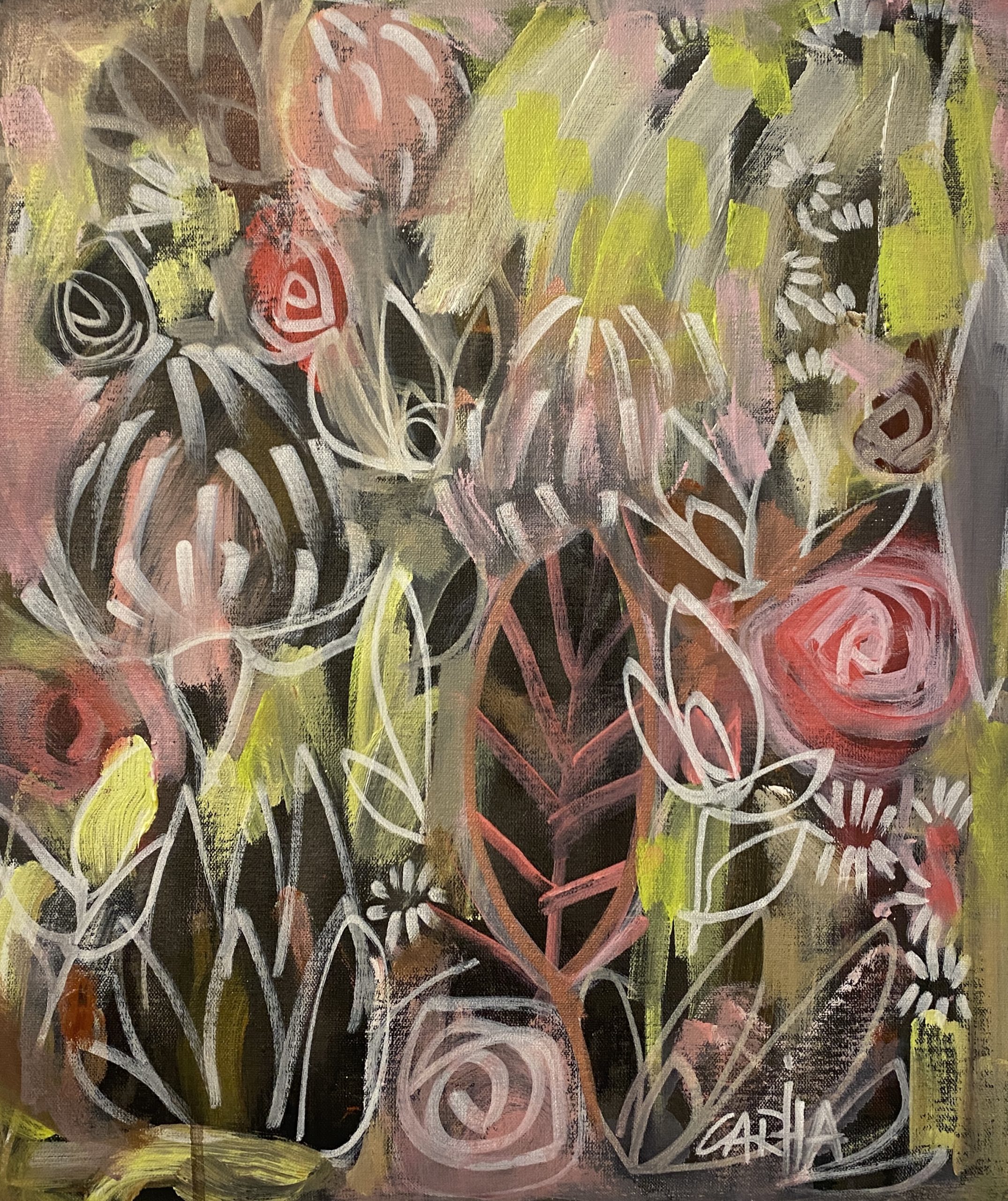 Carita’s series of “boho botanical small studies” are small, playful and expressive artworks created through a highly intuitive process. Each piece explores Carita’s ongoing theme of finding an OASIS where connection to Mother Nature brings connection and discovery of true self and the beauty that lies within.