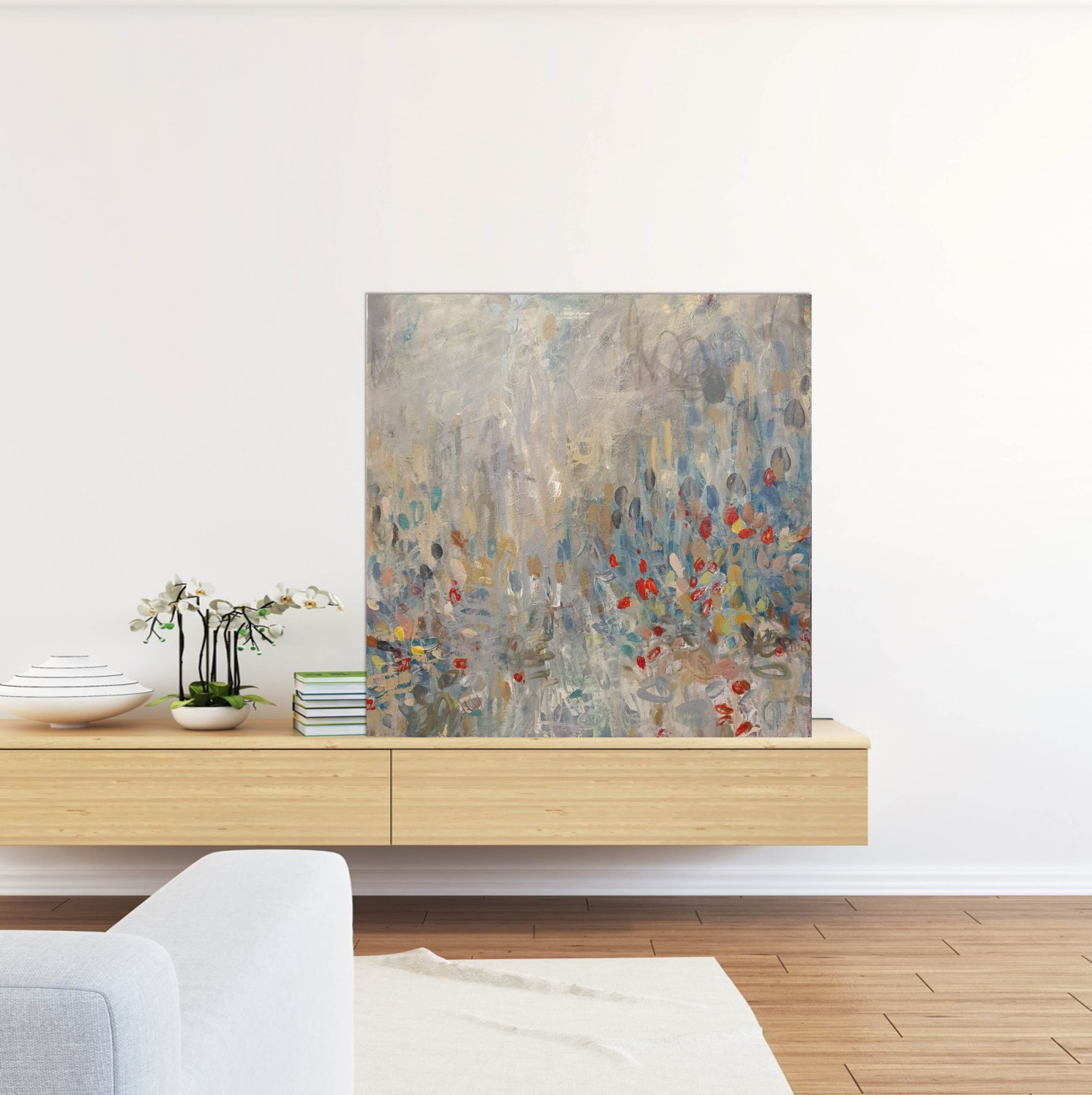 Shades and dilutions of dusty nude pinks through to terracotta, blues, soft ochre, cream and khaki accented with warm earthy neutral tones, pops of red, yellow, teal, warm and cool whites all add interest and dimension to this lightly textural original. A pretty and decorative work.
