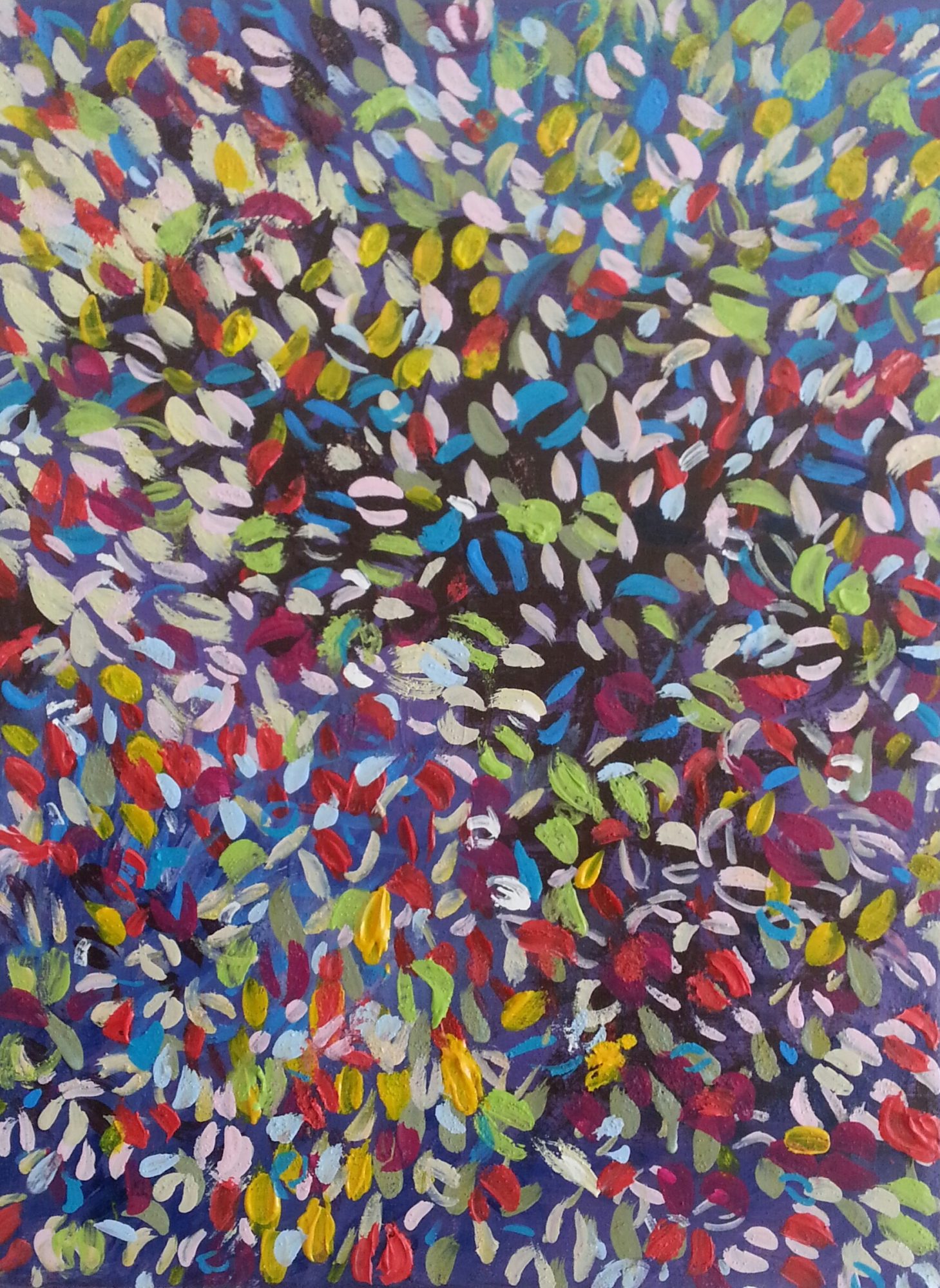 Little Wildflower Profusion is a lively and fun abstract original artwork on canvas representing vivid and varied wildflowers. It is finished with neutral sandstone colour edges and a protective light satin layer. Rustic and textural in treatment, this pretty artwork will make a nice feature complementing spaces styled with neutrals or deeper wall shades equally.