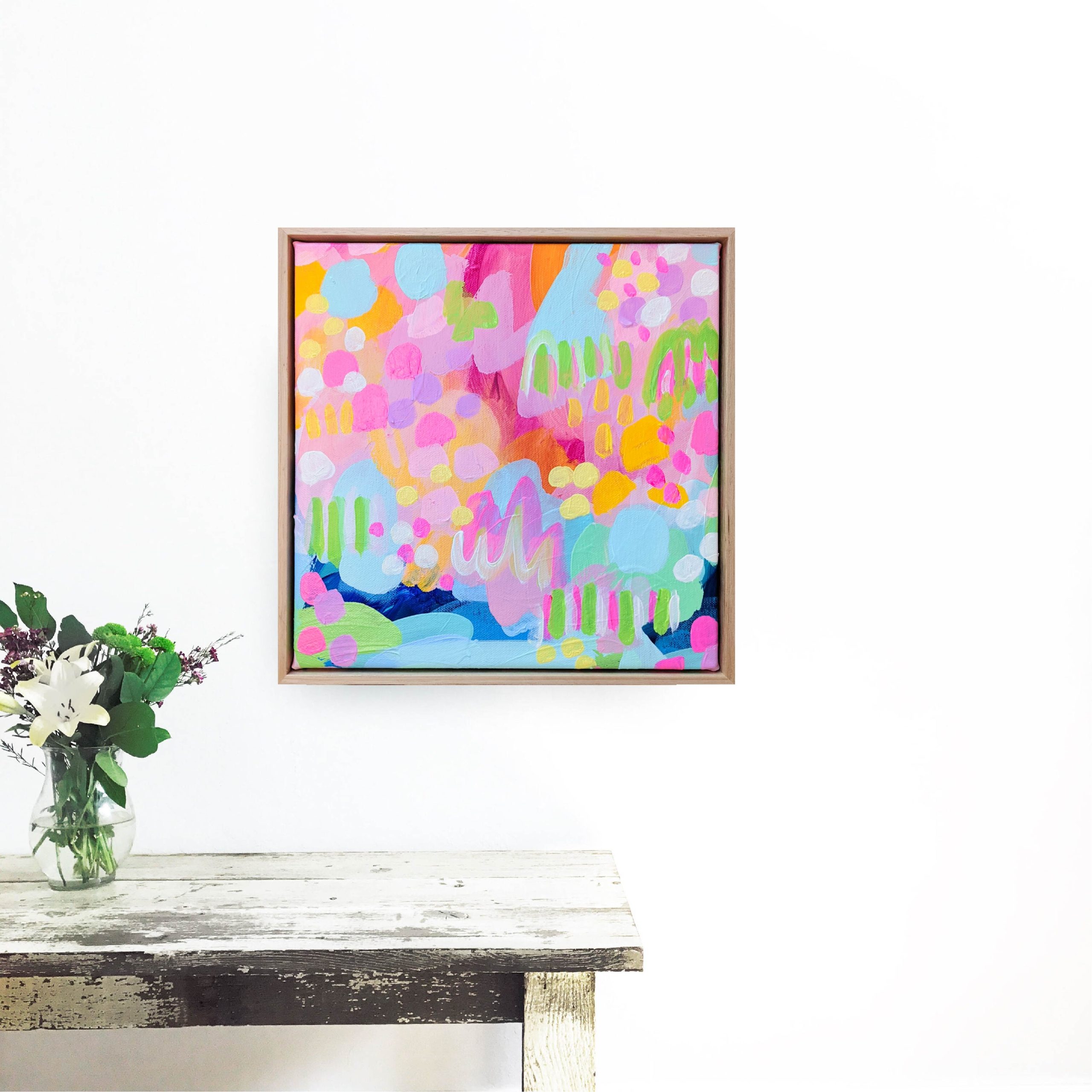 Acrylic on hand stretched canvas framed in a raw Tasmanian Oak floating frame.