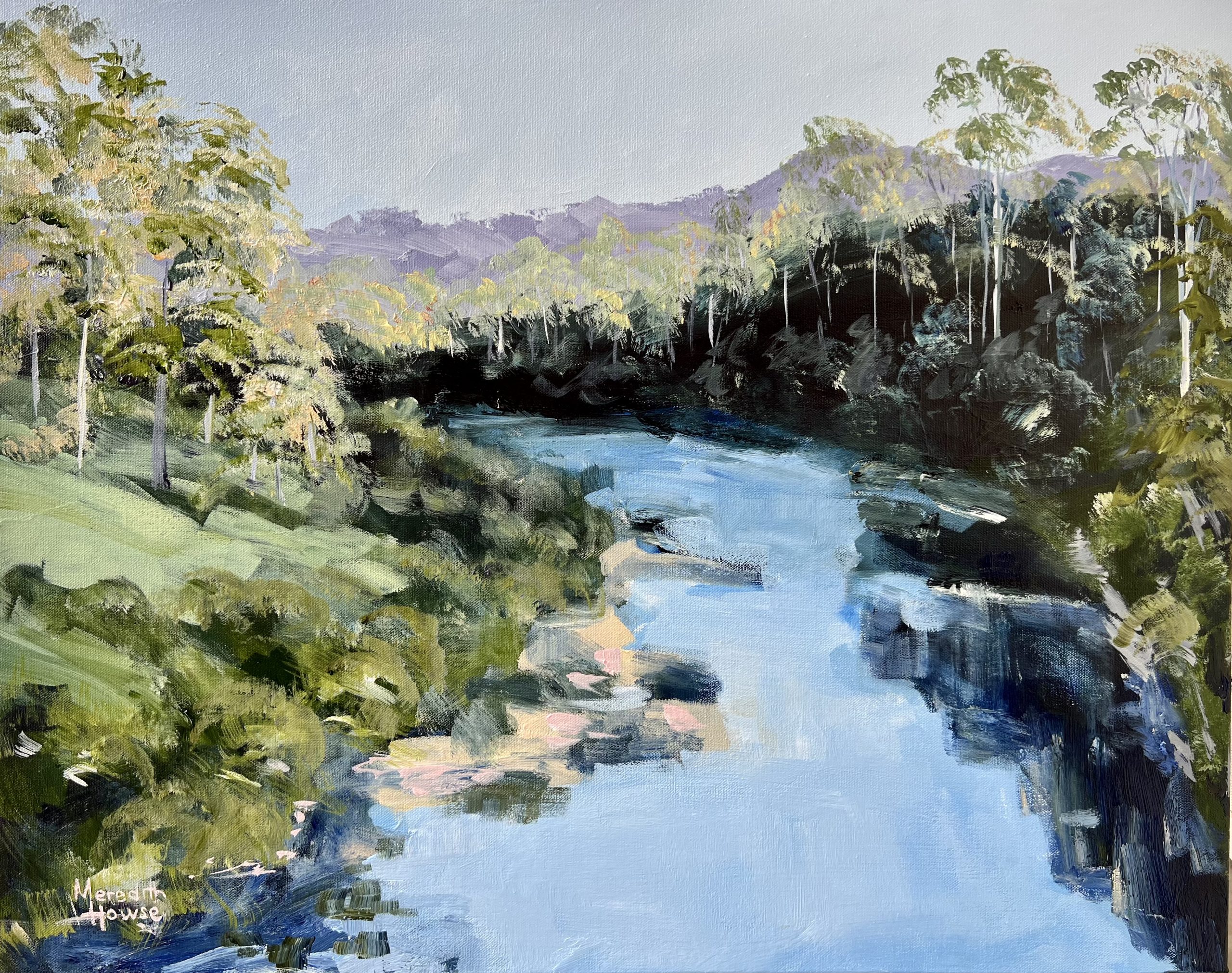 Howse brings Little Yabba Creek to life. The painting depicts the lush vegetation of the area, with earthy greens. Sky blue reflects on the water. The artist’s loose brushwork lends an organic and fluid quality to the foliage, enhancing the sense of movement within the scene.