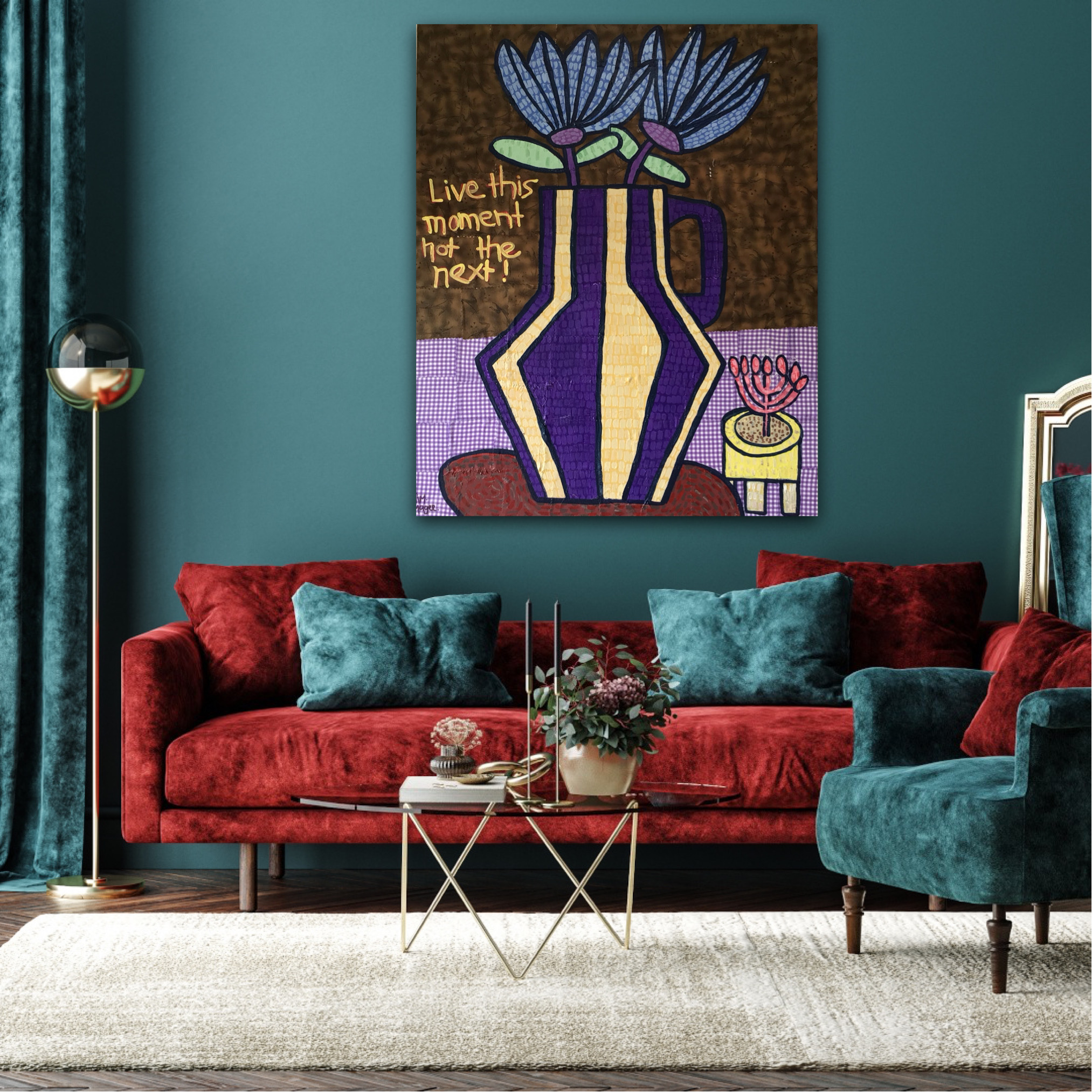 This original mixed media collage painting titled “Live This Moment, Not the Next” by Australian artist Kim Magee is a stunning addition to any art collection. Measuring 75cm in length, 60cm in width, and 2cm in height, this medium-sized artwork features a still life vase with flowers in a vibrant, multi-colored art deco style. The canvas painting is signed by the artist and comes with a certificate of authenticity issued by Kim Magee. It is ready to hang and would make a beautiful statement piece in any room. Don’t miss the opportunity to own an original artwork from a talented artist.