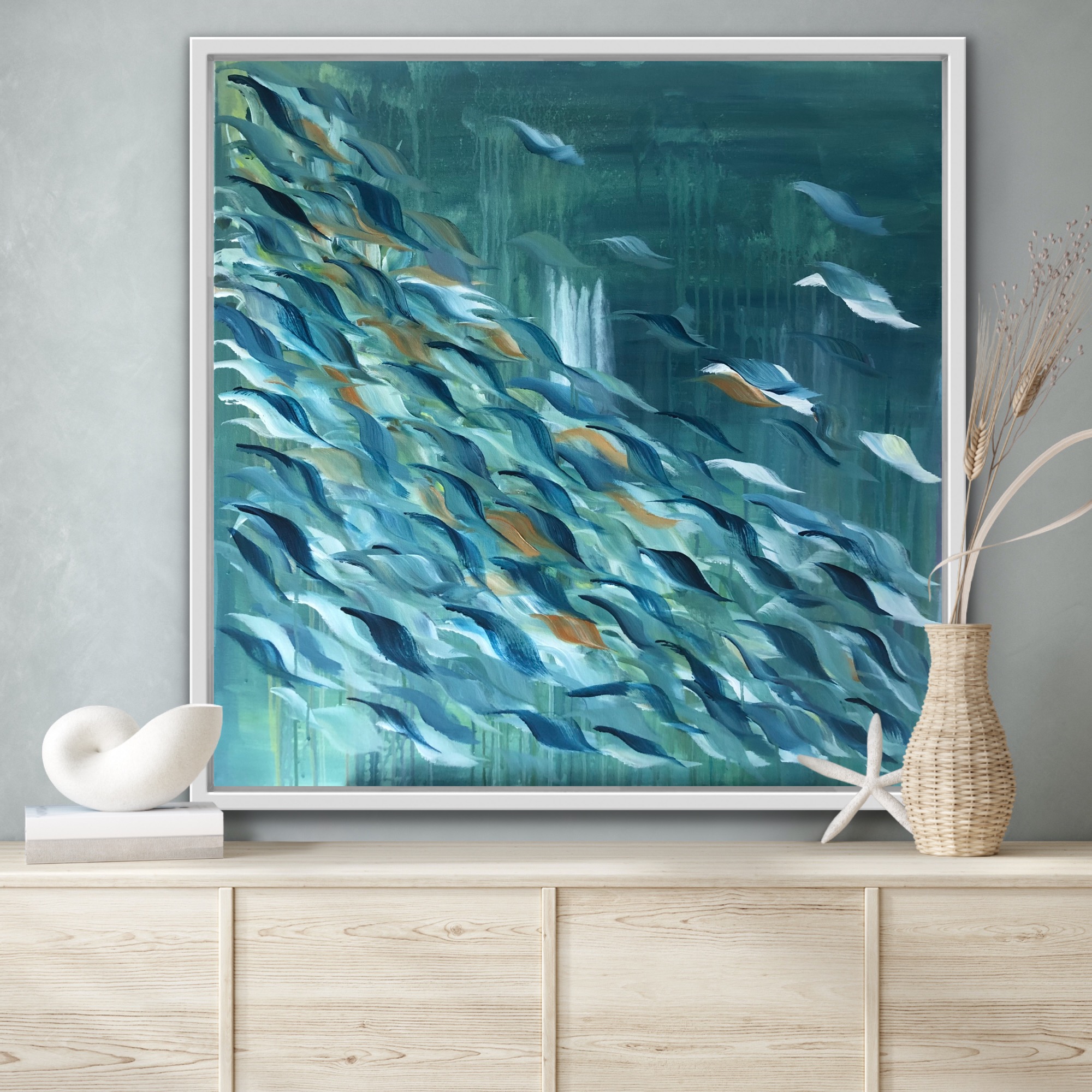 The colors of nature, tropics and sea with light feathery strokes of brush will bring smile each time you look at her!