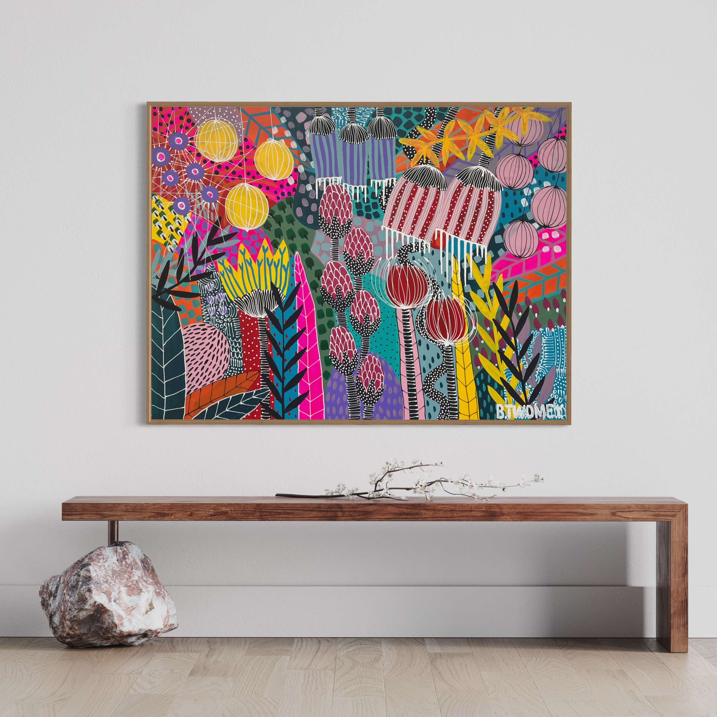 An original artwork on triple primed gallery quality canvas, ready to hang in sustainable hardwood float frame. 122cm x 92cm canvas size (125cm x 95cm framed)