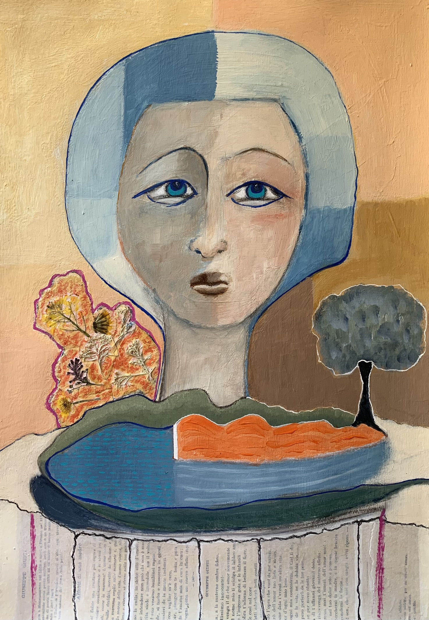 I saw the tiniest little faded face in a corner of a dilapidated fresco in Pale a little town close to Foligno in Umbria, Italy where I was for six months in 2022. I couldn’t get it out of my mind and started creating an image from memory on thick Strathmore mixed media paper adding some collage made from dried flowers in the fields around us and pages from an old poetry book from the beginning of the nineteenth hundreds I found on the local antique market. This image has gone through a lot of layering before I got where I wanted it. The seriousness portrayed in her face was exactly how it hit me and I couldn’t help thinking she was watching us people and pondering what we are doing with our environment our precious beautiful world. It was extremely hot while we were in Italy, the longest heatwave they’ve ever had. We really felt it. I named her Livia, a girls name from Latin origin meaning blue…..which of course evokes incredible symbolism.