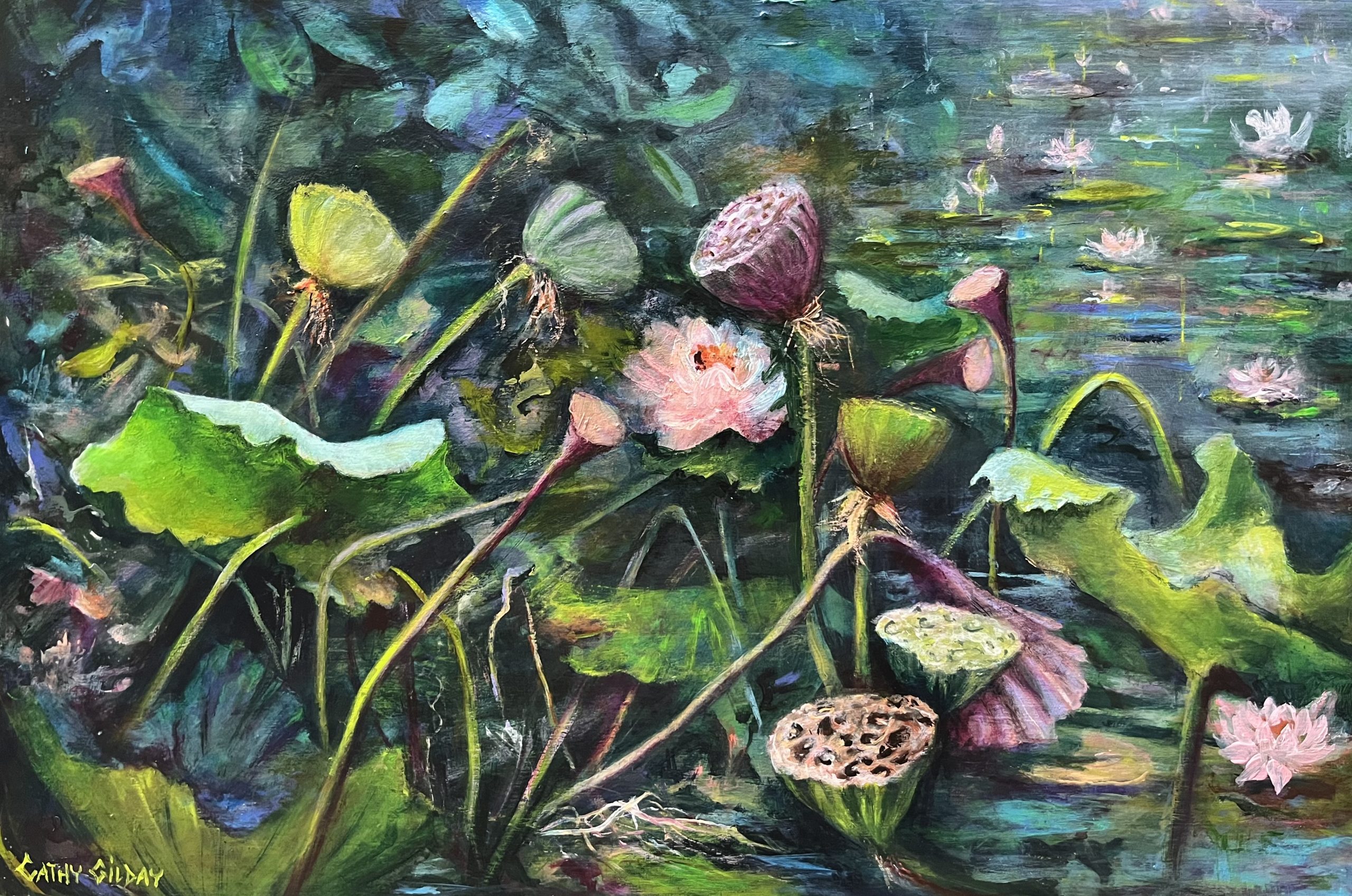 The lotus flower symbolises purity, enlightenment and regeneration. I think the fact that these beautiful plants grow in muddy waters is quite astonishing. Like so many artists, I can’t resist them as a muse for my paintings. I have used bold, deep colours, which have given the piece a beautiful rich feel.