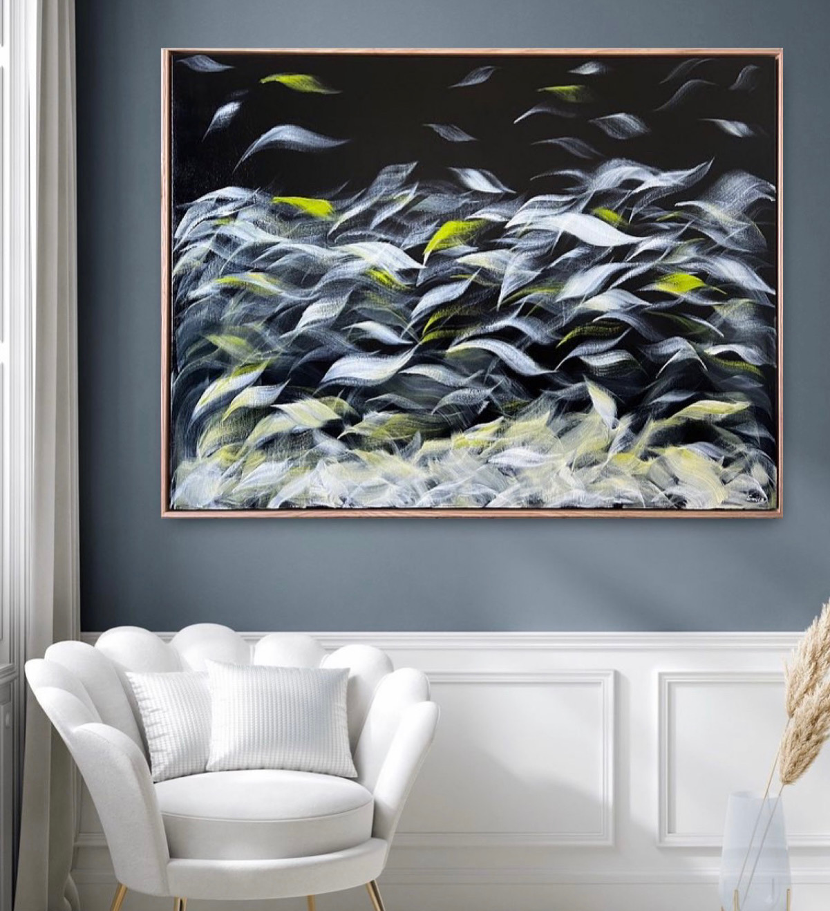 The black, pearl white and silver colors with touch of Australian yellow green on canvas with light feathery strokes of brush will bring smile each time you look at her!