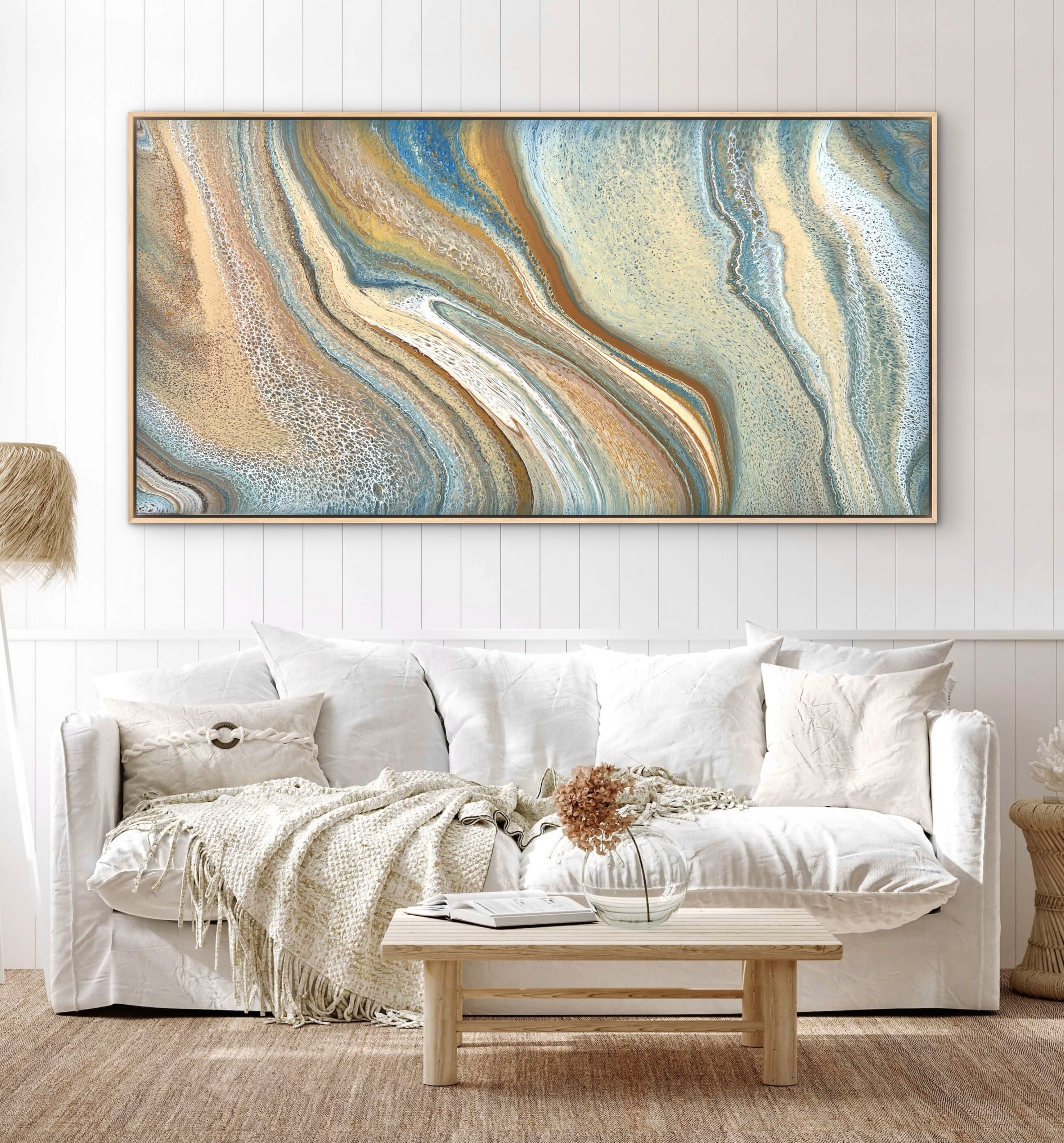 Rich metallic gold moves alongside sandy creams, soft whites, and deep charcoal, interwoven with earthy mineral blues. Subtle highlights shift with changing light, giving the work depth and a dynamic presence that transforms throughout the day.