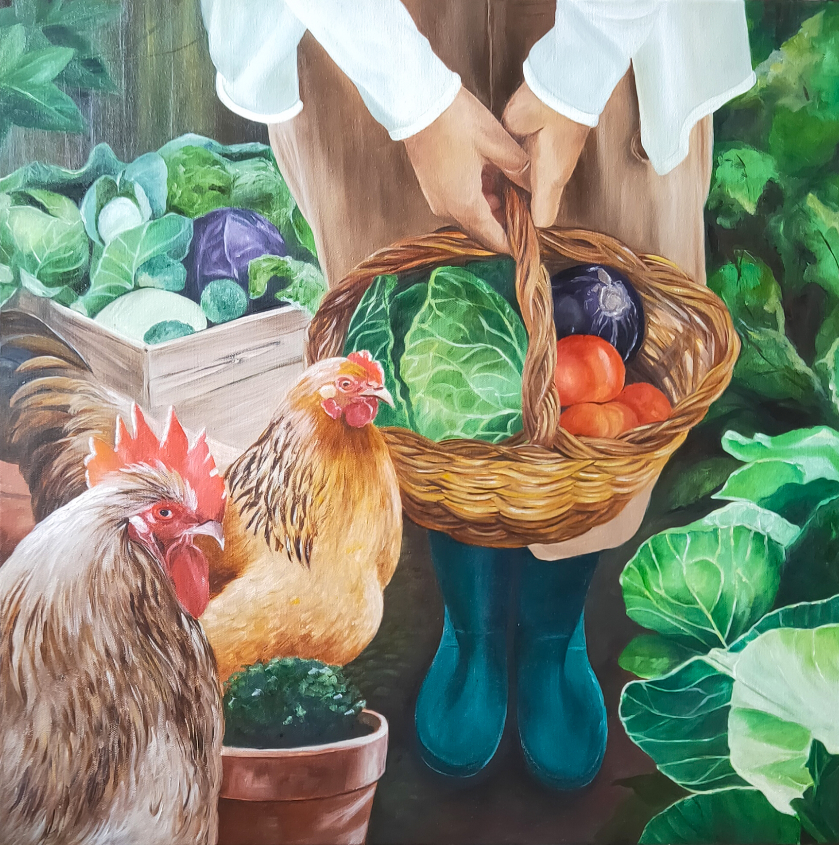 Hailing from rural Kent in the UK, Kay has a love for the country life and enjoys growing veggies and tending to her chickens. This painting reflects her happy place and she really is ‘Living the Dream’.