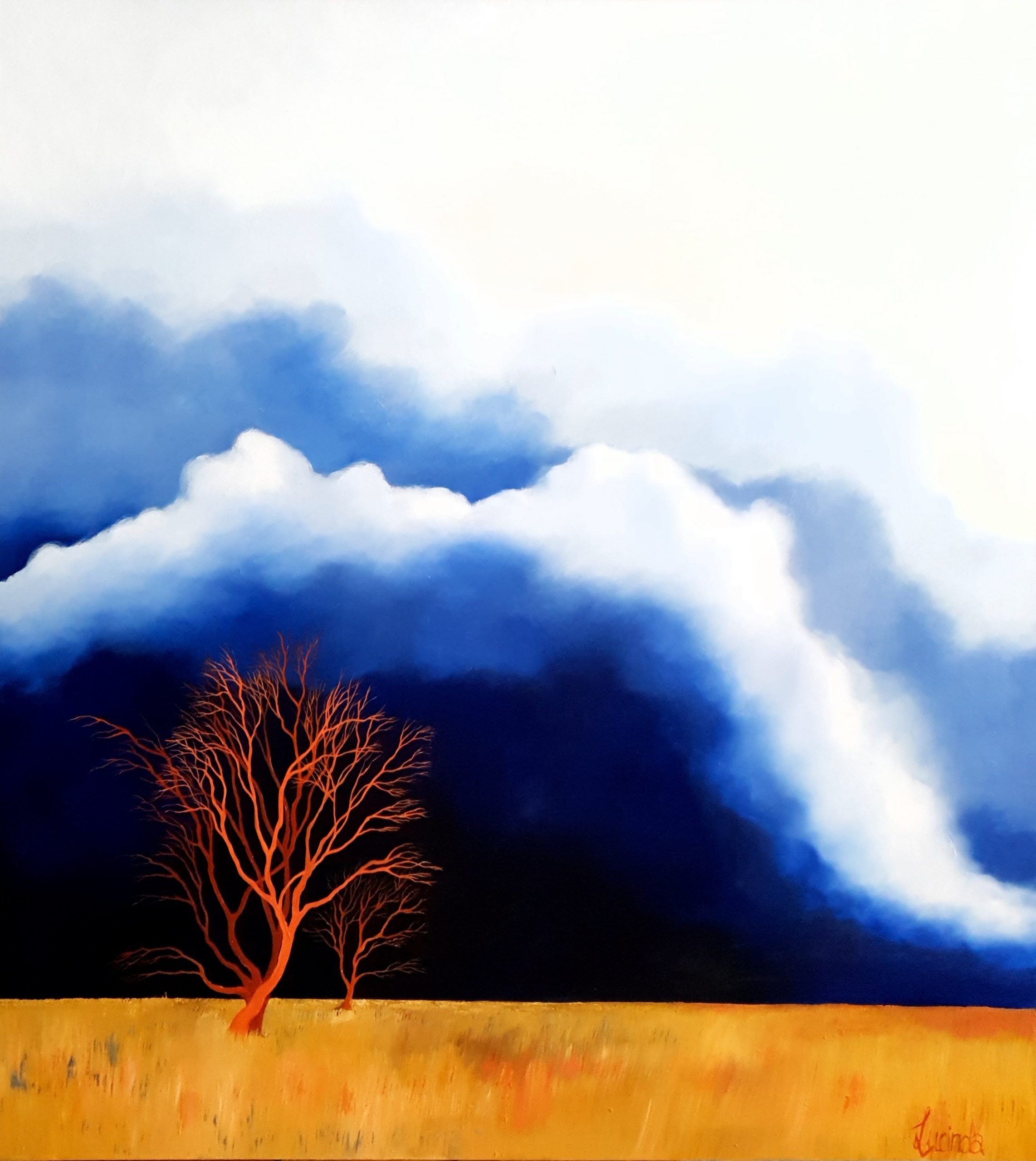 I love to paint trees and clouds – doesn’t matter what colour or type of tree although the bare branches are my favourites. The simplicity of the image contradicts the fine details of the branches and the complimentary palette – leaves me contemplating how opposites work so well together.
