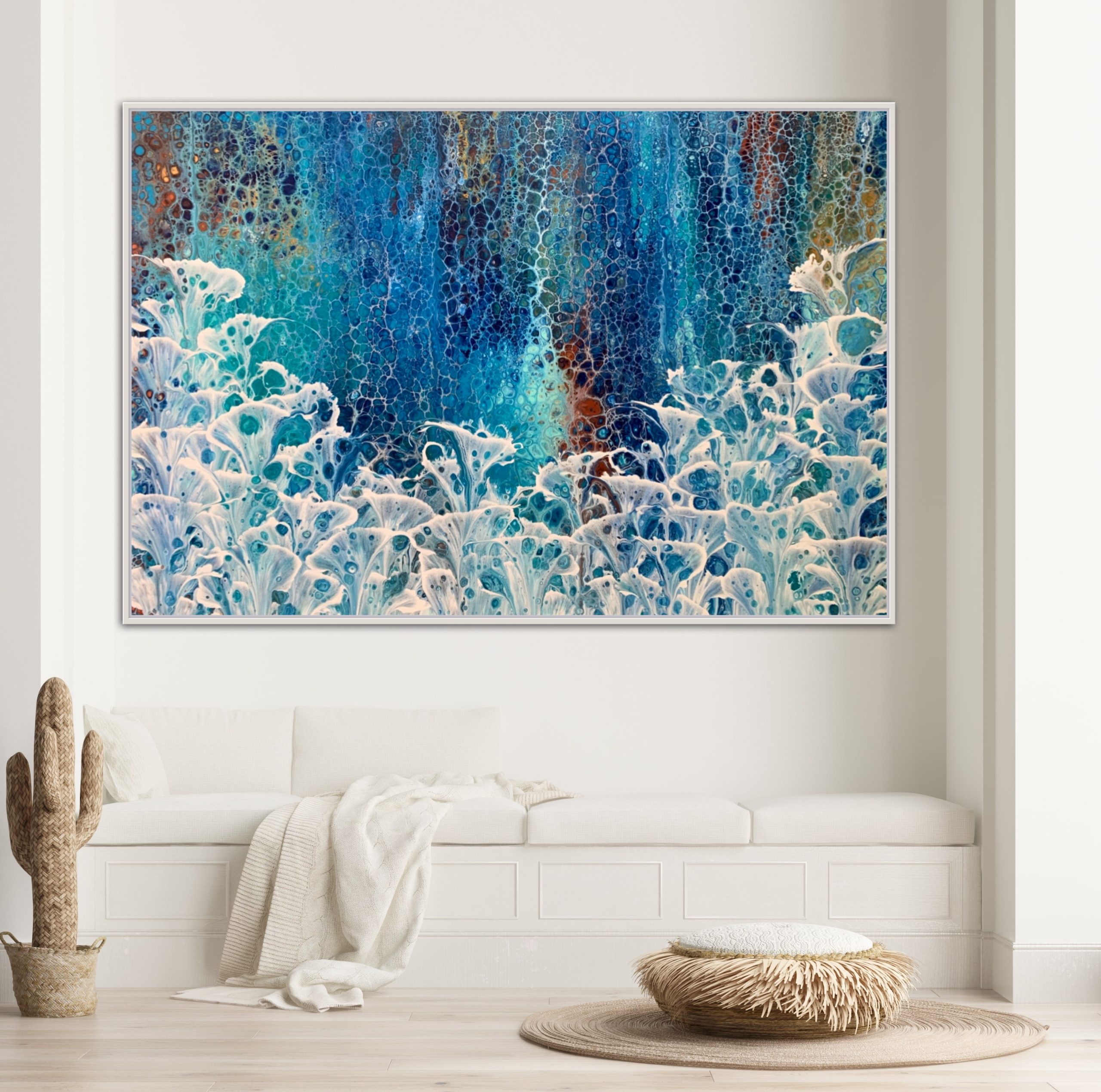 Living Valley is inspired by nature and depicts in abstract Calla Lilies growing tall and in abundance with a lush valley full of colourful flora behind. Created using various techniques combined to allow increased flow, interaction and separation of colours to create interesting patterns where pops of colour can be seen emerging from underneath. This added dimension adds lace and cells to the artwork creating an interesting and one of a kind painting that can never be replicated.