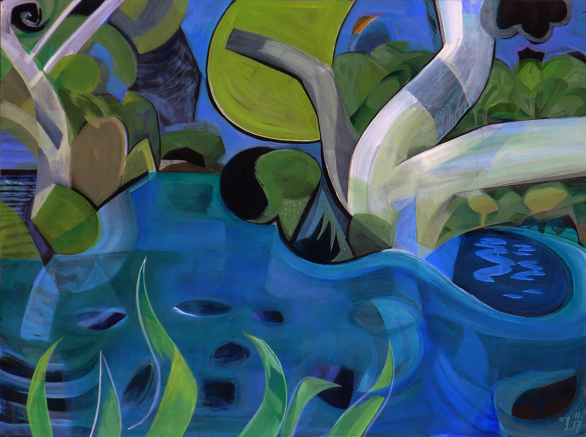 Atelier Flow acrylic on high quality cradled panel. Gloss varnished (3 coats) with UV protection. Edges sealed with black lacquer.