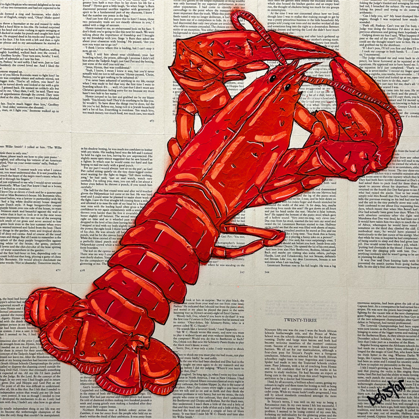 It has been created with layers of acrylic paint and has texture paste added to the lobster to make it pop off the book pages which are attached to wood panel.