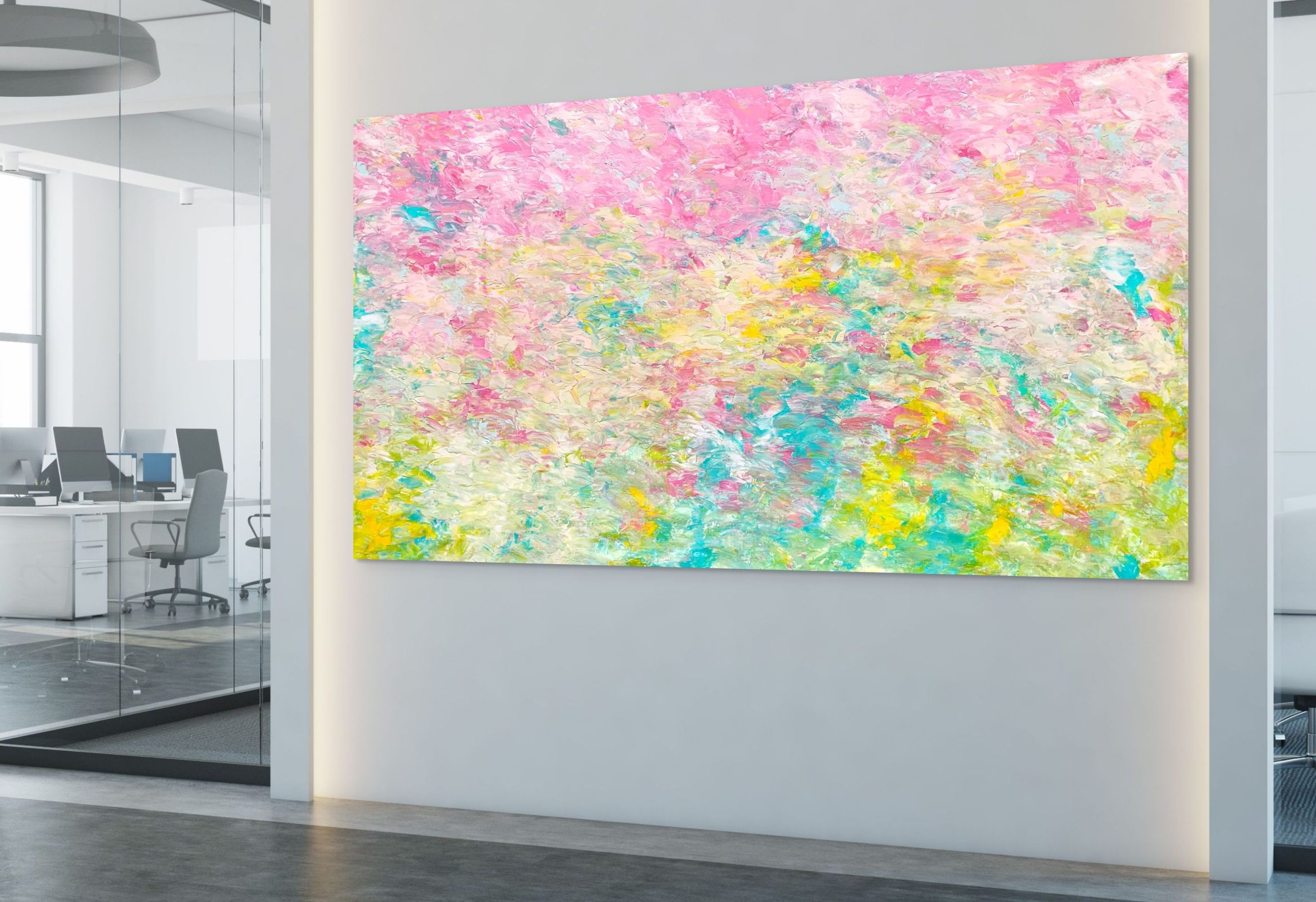 This artwork is painted on professional-grade canvas stretched and sealed with varnish. The canvas has dimensions 200 cm in width by 105 cm in height. The painting is painted on the sides in a different colour.