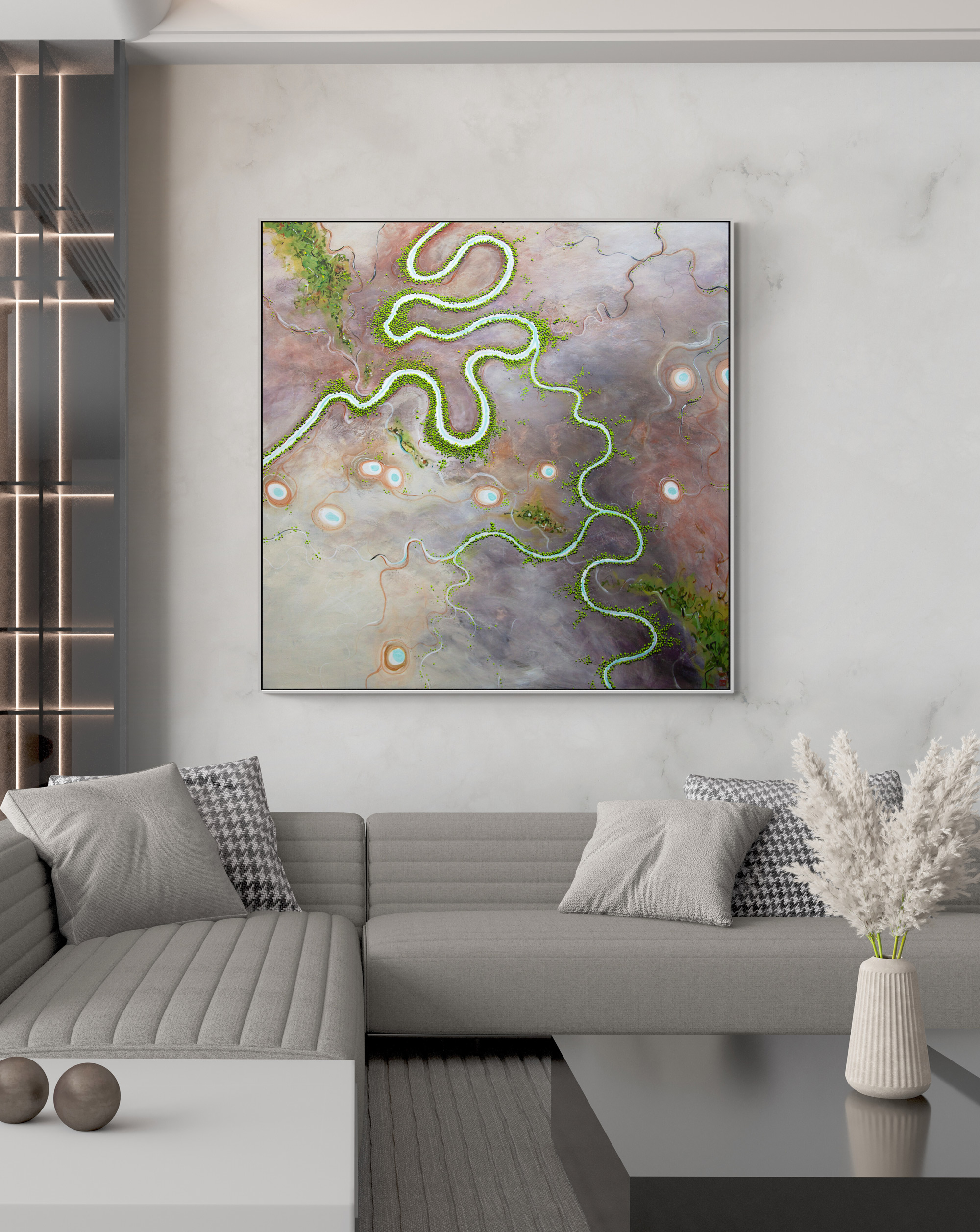 Long Time Coming by Tania Chanter is an aerial landscape inspired by the rich and vibrant tones of Australia and the changes of light and mood throughout the day. Tania’s hope is that this painting brings a sense of calm to the room where it lives, and that is makes the people who enter the room feel as though a part of nature is right there with them.
