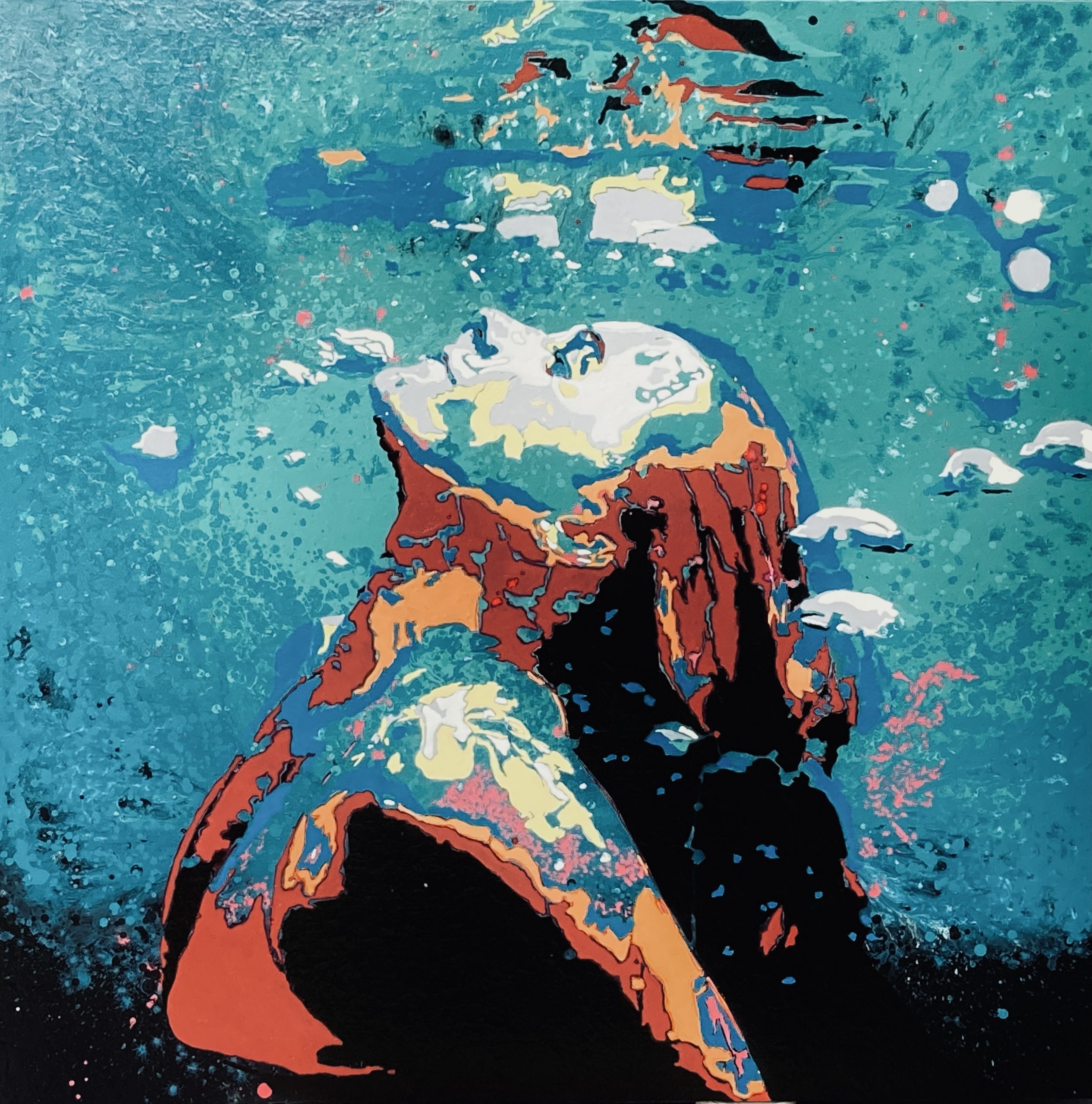 I work from created and found photographs and film stills, and I captured this image from a film still of the unofficial film clip for the Odesza song “Sun Models ft. Madelyn Grant”. One of my favourite songs to listen to in the studio whilst painting, I wanted to capture the moment just as the model was about to break the surface and first glimpsed her own watery reflection. To me this offers the opportunity to relive that kind of moment, and also that moment of coming across my reflection unexpectedly, and maybe, just maybe, questioning “who” I truly am. I think we all have moments like that – and sometimes this watery reflection is what we find. I’ve used contrasting colours in teal, orange and red, providing a varied and bright palette. In this square composition of an underwater world, the light highlights her face and the large bubbles float up past her as she anticipate her next breath. I have developed my style using contemporary art techniques such as expressionism and pop art. Named after William Shakespeare’s Sonnet 3 of the same name, because, well, what do you tell the face thou viewest?
