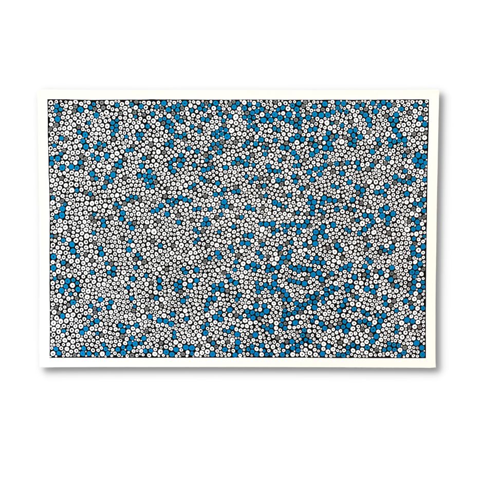 Look Outside by Dessie O’Gorman – An original abstract painting featuring hundreds of white, grey and blue circles on a black background with a vehicle painted border.