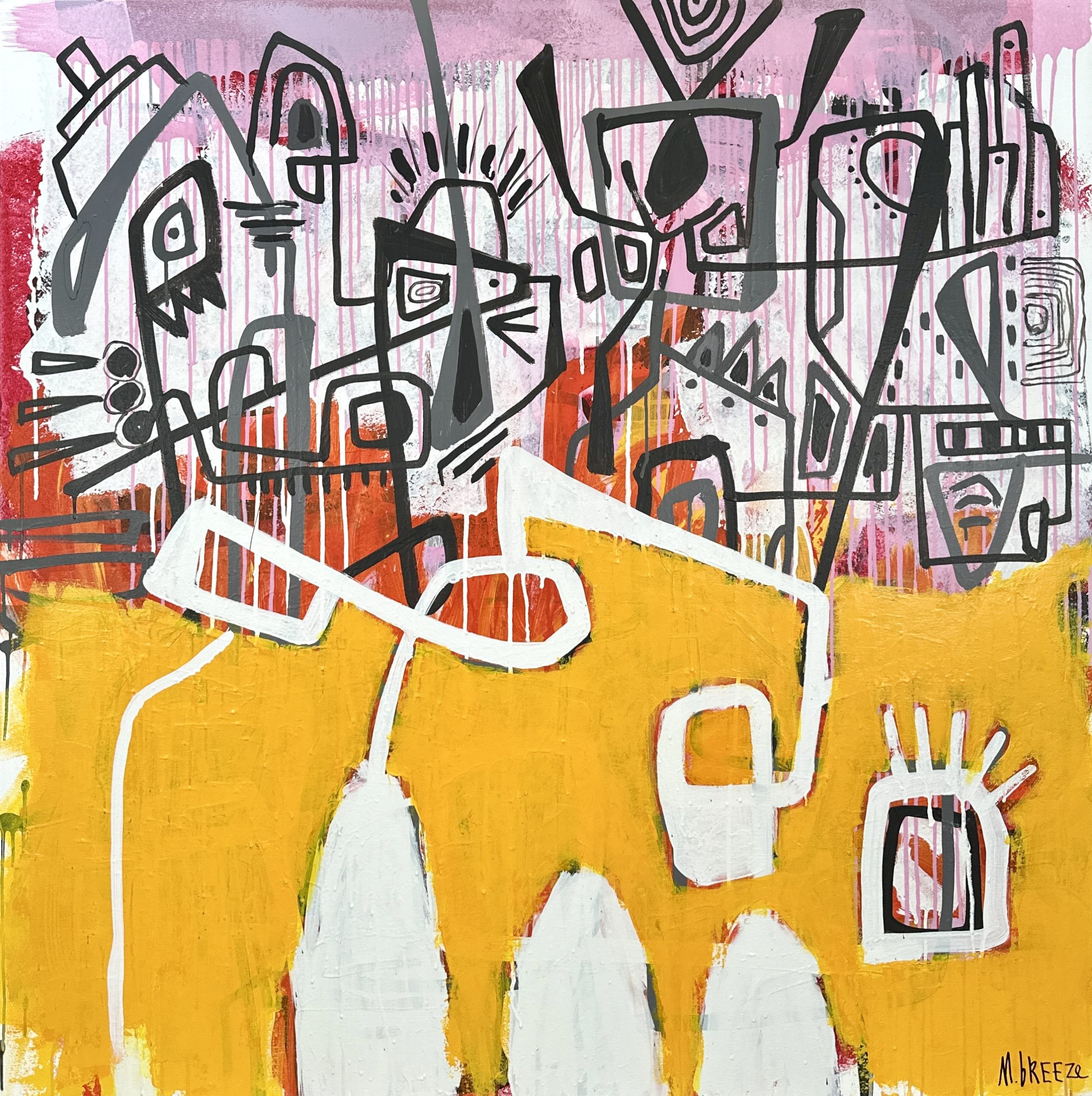 Bold yellows, restless lines, layered forms—this piece holds its own energy, like an inside joke between the canvas and me. The title? It surfaced as they often do, unplanned but somehow inevitable.