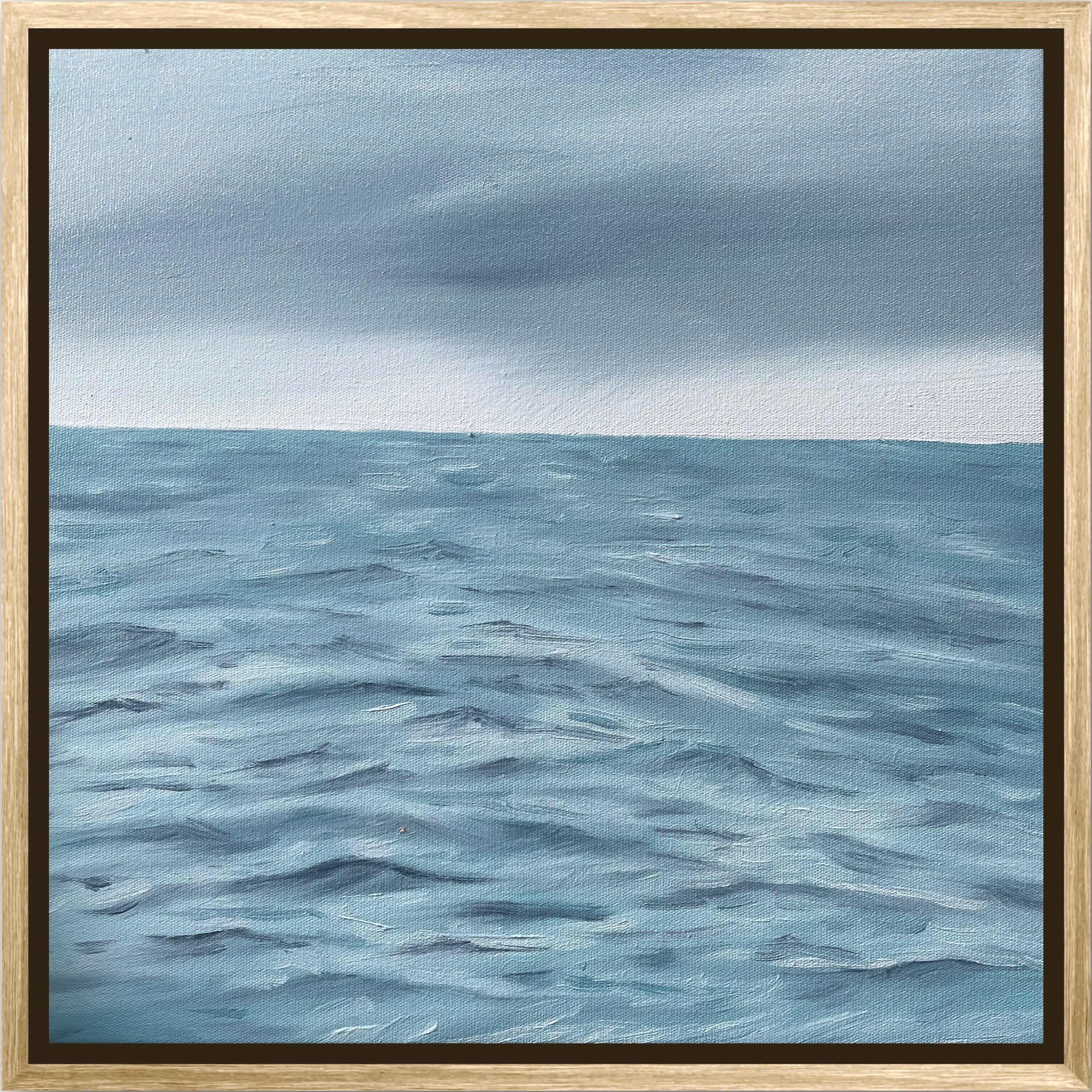 This painting has turquoise accents with light & dark grey. The edges have been painted under the Australian timber frame to ensure no exposed canvas is seen.