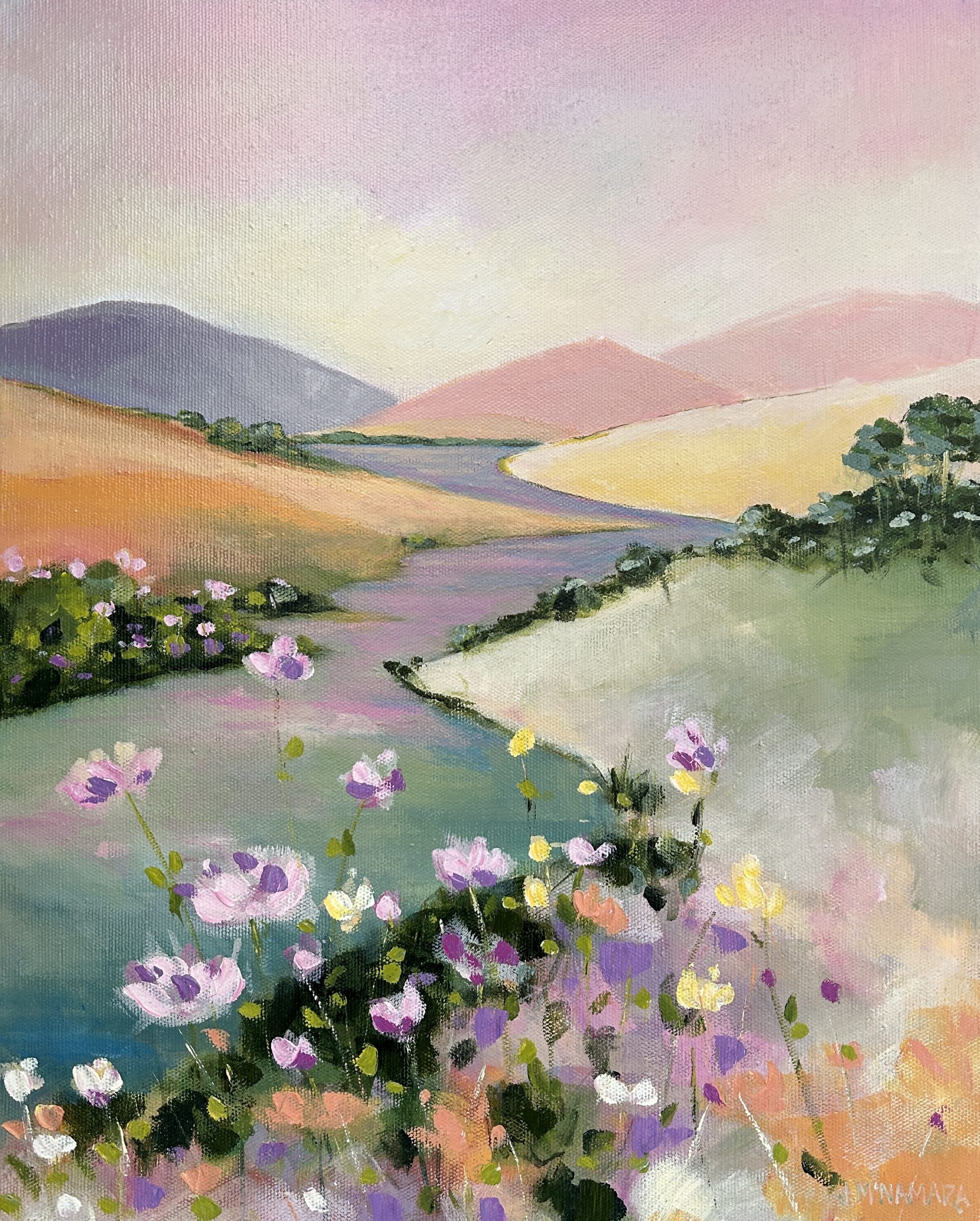 Looking Through a Field of Flowers by Jenny McNamara-Furlong – This artwork is painted from a collection of ideas created through a commission for a friend. She wanted a soft whimsical, pastel landscape to add some piece and quite to her living room. I created a series of small works for her to choose from before I completed her large commissioned artwork. I like to call them my Disney landscape Series.