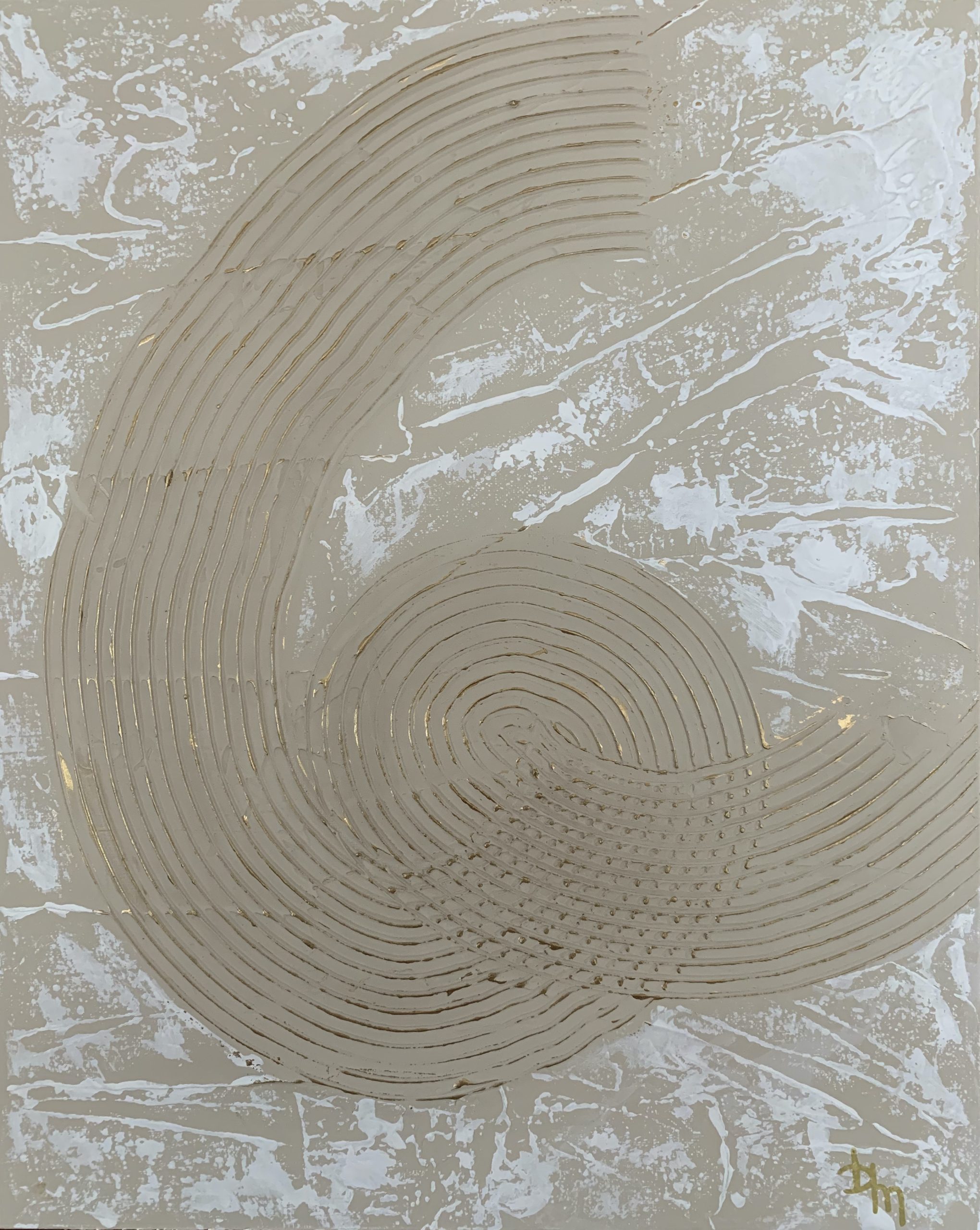 Looped Gold by Bronwyn Muzzin – Mildly-textured surface with gold highlights. The gold appears more obvious the closer the viewer gets to the painting; with the gold almost disappearing from view the further away the viewer gets from the painting.