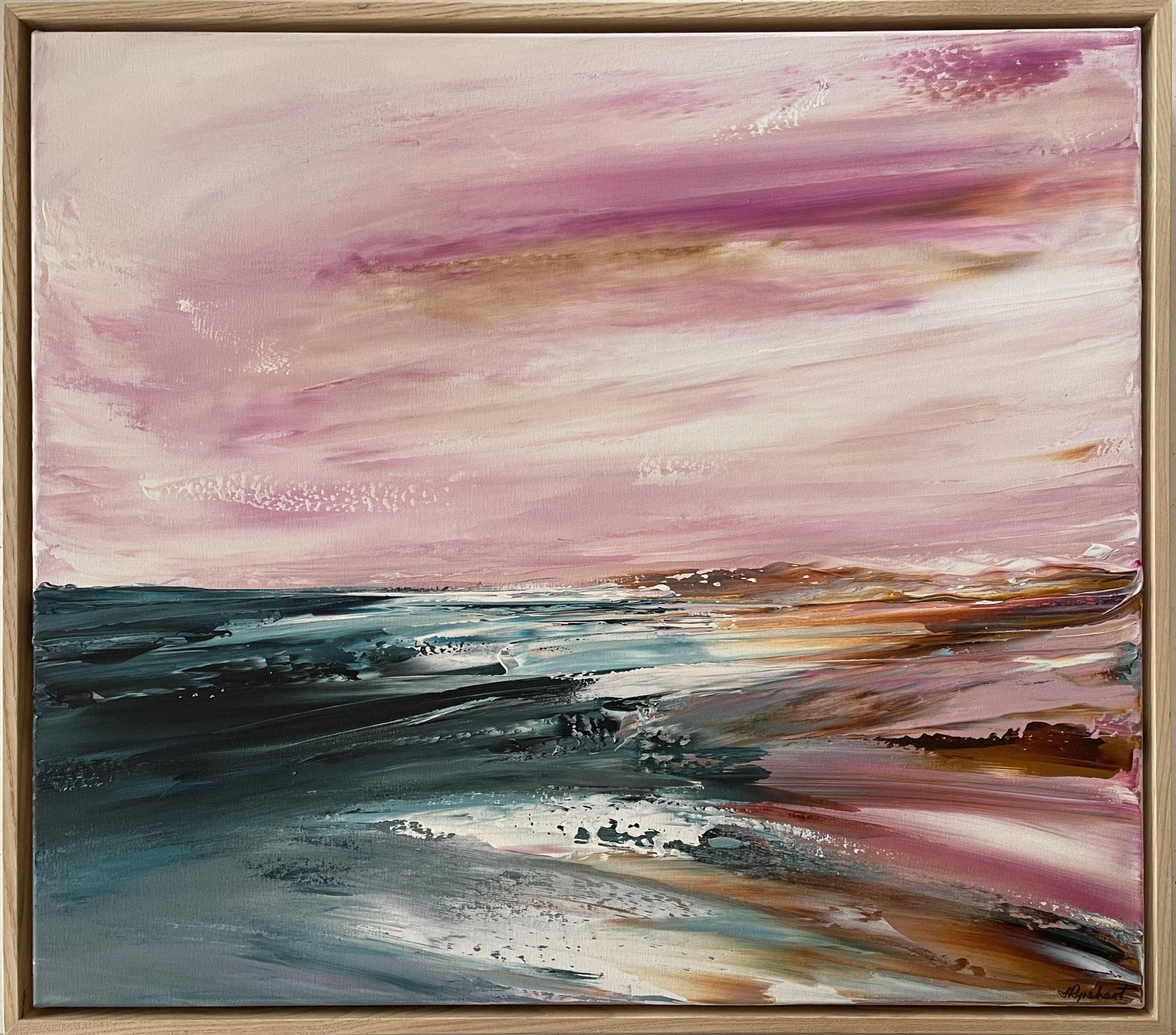 Created on artist quality canvas with palette knives, this bold expressive seascape reminds me to treasure time…time with loved ones. It is framed in an Ash timber frame, satin varnished and comes with a COA.