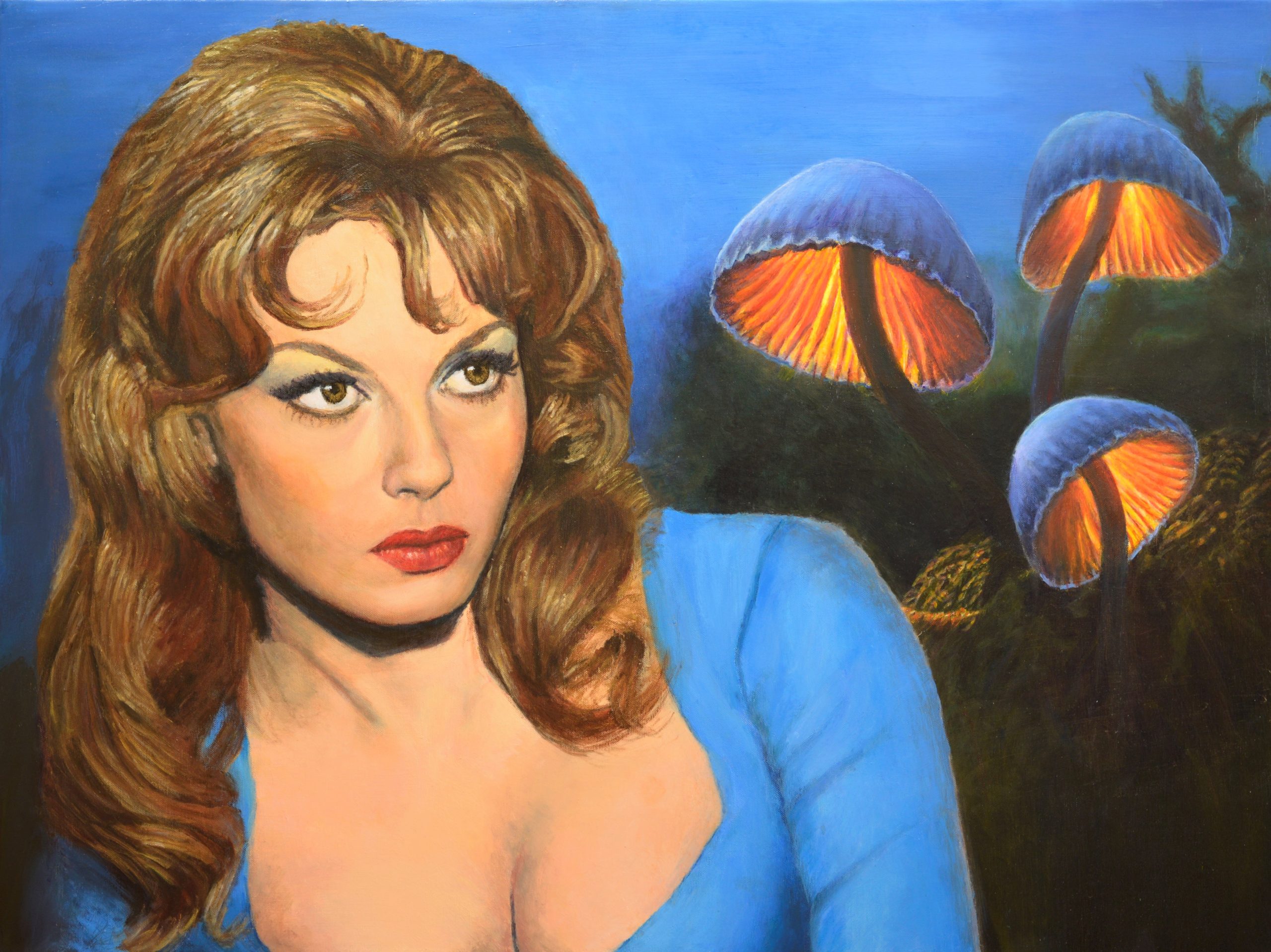 Jane Ianniello has appropriated a publicity still of a 1960s French movie star, Michele Mercier, and placed her against a surreal background of huge bioluminescent mushrooms. The title “Lost in the Forest (All Alone)” alludes to the dazed and disorientated expression of the beautiful woman. This acrylic painting on canvas is ready to hang and has beautiful metallic and interference acrylic colors and a gloss varnish finish. The main colors in this wall art are blue and warm orange and yellow.