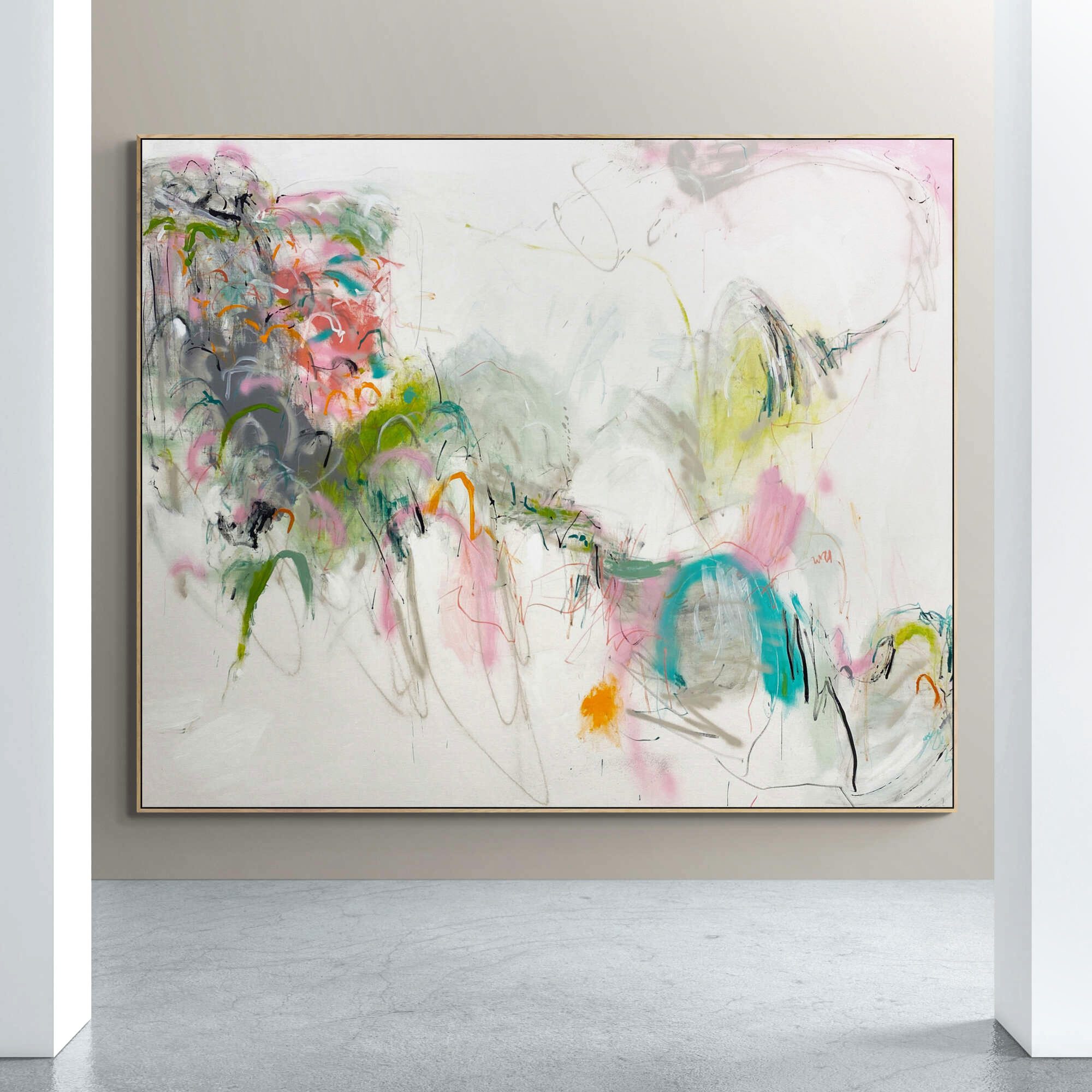 In this expressive piece, I’ve layered acrylics marks, letting spontaneous emotions guide my hand. The brush strokes and bright palette of orange, pink, green, white, grey and black infuse dynamic energy, converging abstract thoughts with semi-abstract forms. It’s a dance of colour and line that will bring a vibrant, thoughtful presence to any space, inviting viewers to explore.