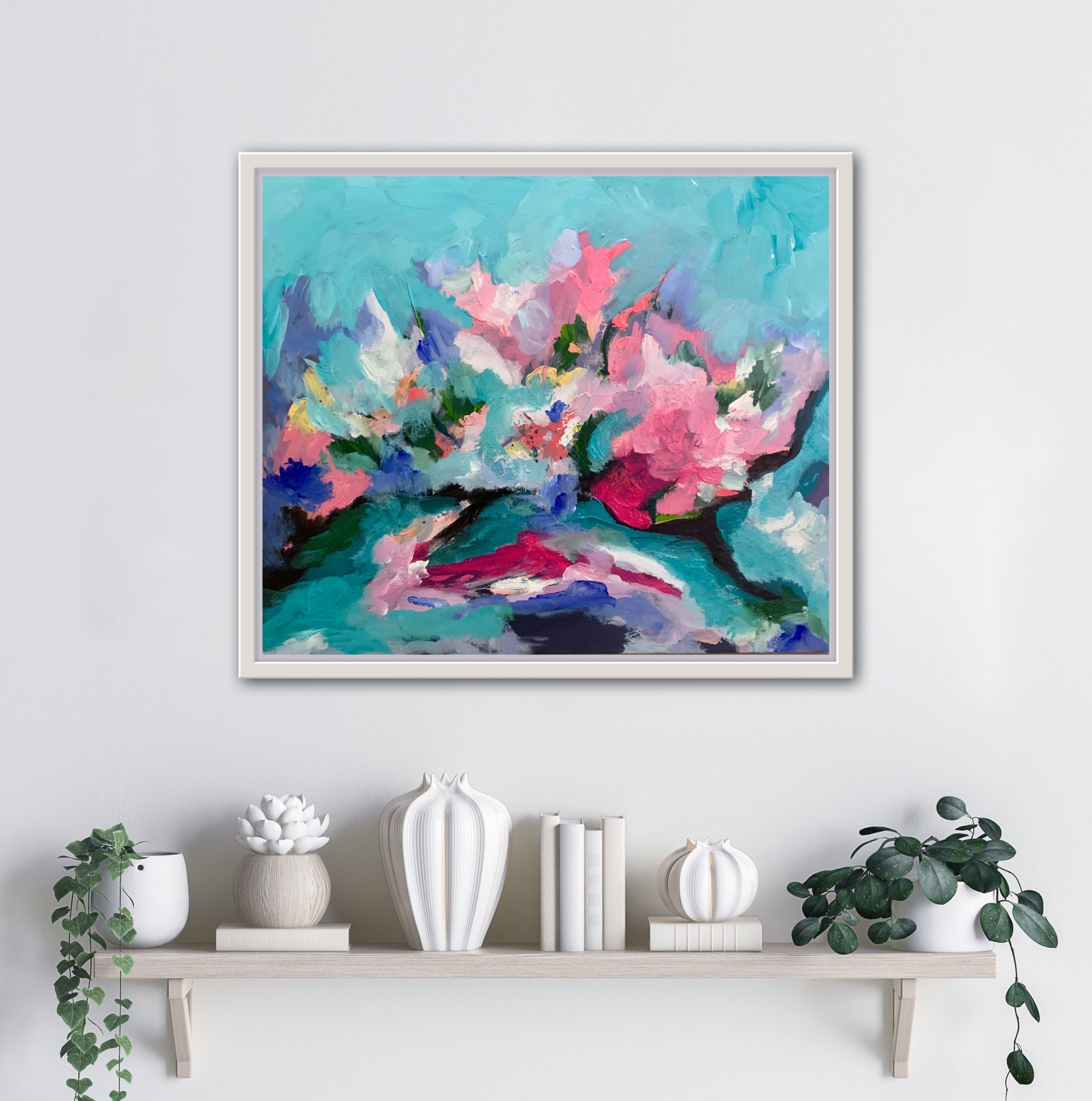 Original abstract artwork. Acrylic paint on streched canvas, and ready to hang. Framed in white floater frame